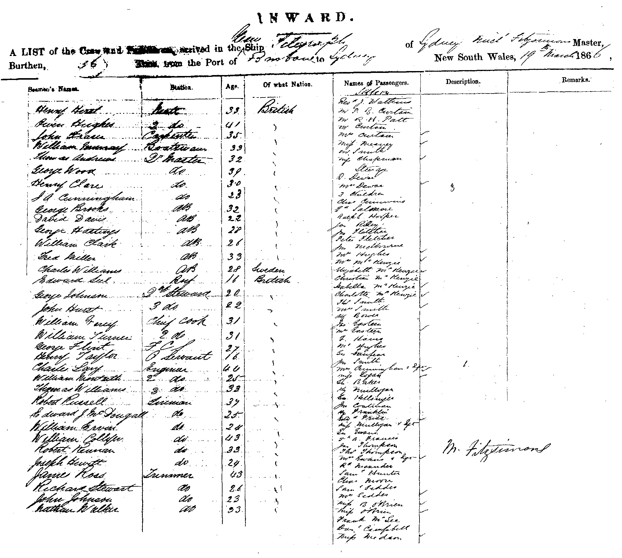 TELEGRAPHof Sydney, M. FITZSIMONS, Master, Burthen 567 Tons FROM the Port of BRISBANE to SYDNEY, New South Wales, 10tht Mar. 1866 |