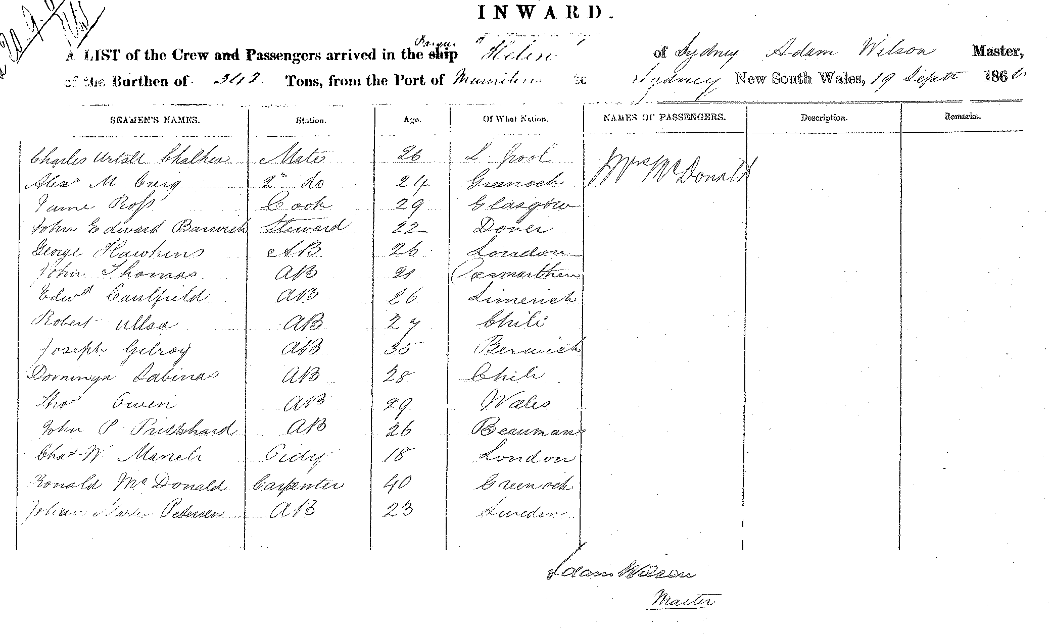 HELENBARQUE, OF SYDNEY, ADAM WILSON, MASTER, BURTHEN 347 TONS FROM THE PORT OF MAURITIUS TO SYDNEY, NEW SOUTH WALES, 19TH SEP. 1866 |