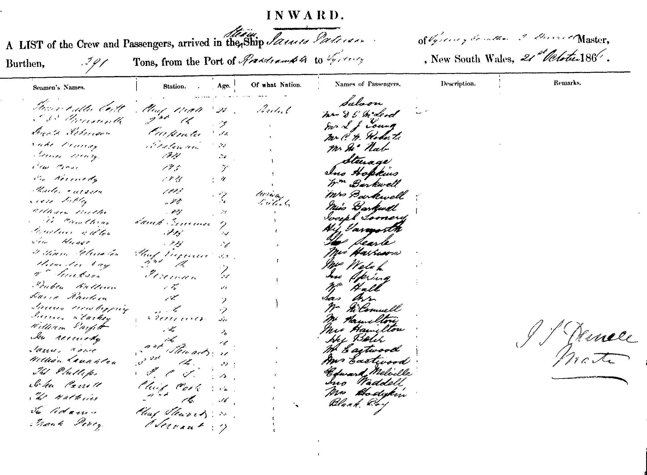 JAMES PATERSONOF SYDNEY, JONATHAN T. DURRELL, MASTER, BURTHEN 291 TONS FROM THE PORT OF ROCKHAMPTON TO SYDNEY, NEW SOUTH WALES, 21ST OCT. 1866 |