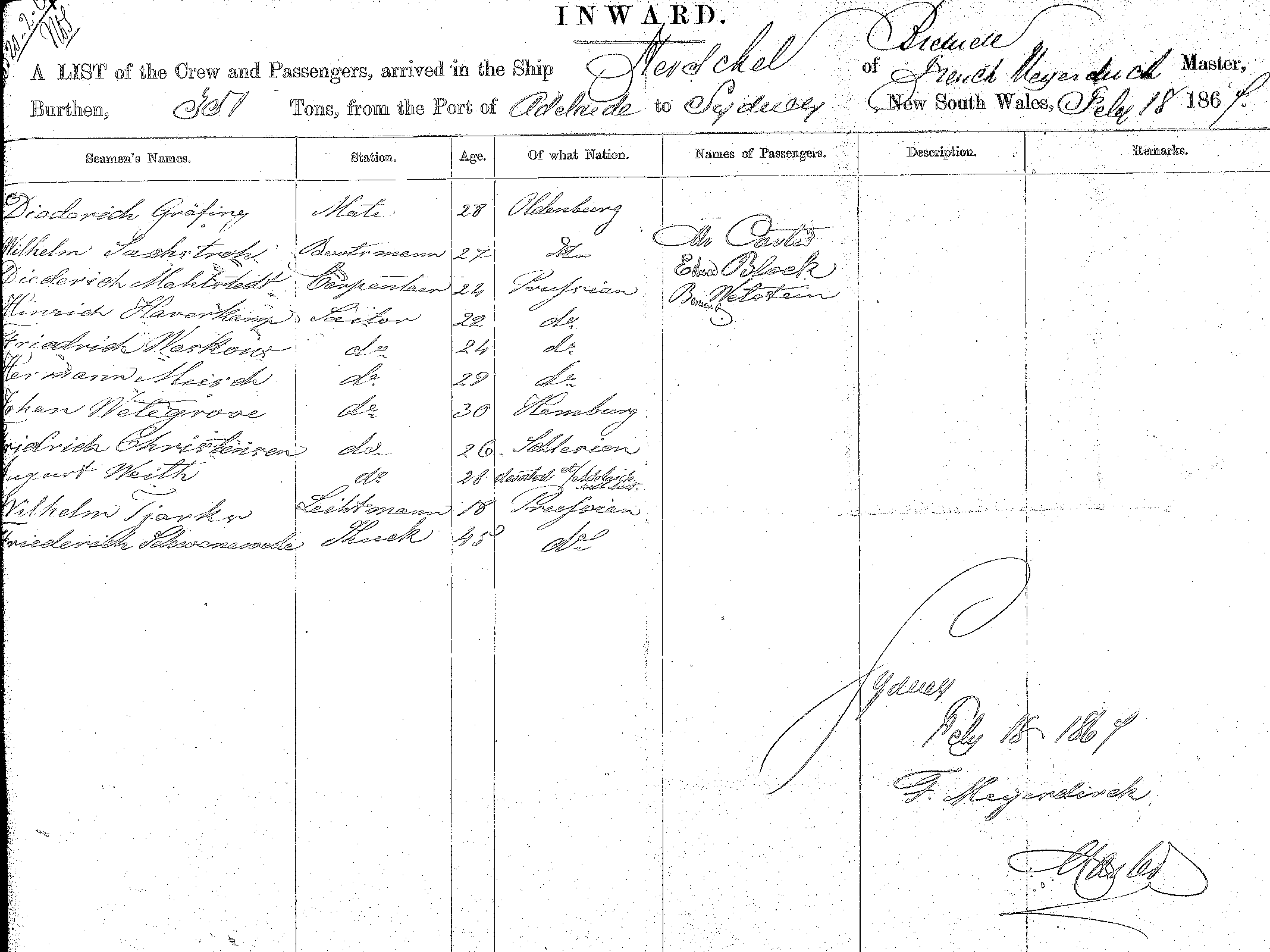 HERSCHELOF BREMAN, FRENCHIEF MEYERDIRCHIEF MASTER BURTHEN 351 TONS FROM THE PORT OF ADELAIDE TO SYDNEY NEW SOUTH WALES FEB 18 1867 |
