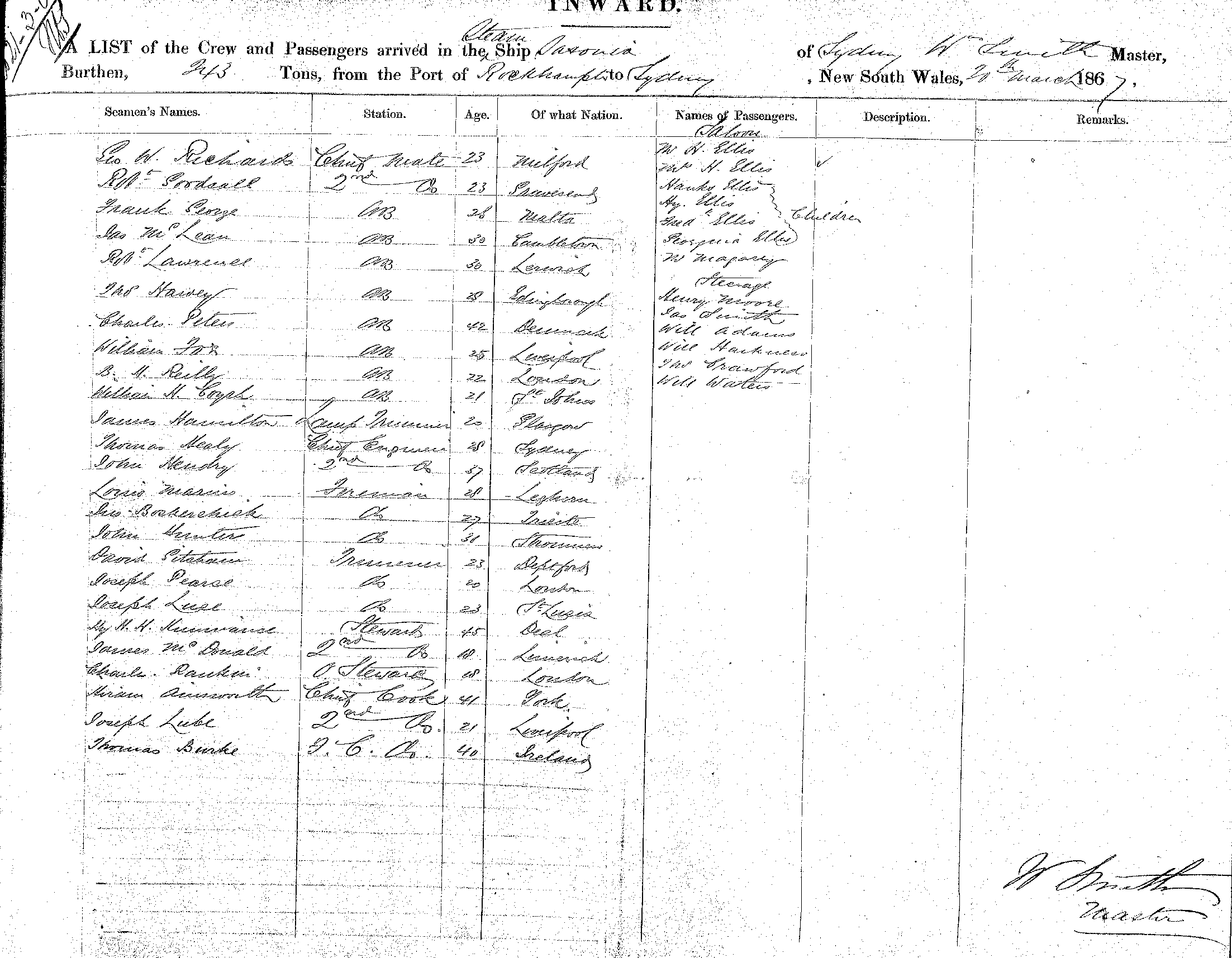SAXONIAOF SYDNEY, MASTER WM SMITH, BURTHEN 243 TONS FROM THE PORT OF ROCKHAMPTON TO SYDNEY, NEW SOUTH WALES, 20TH MARCH 1867 |