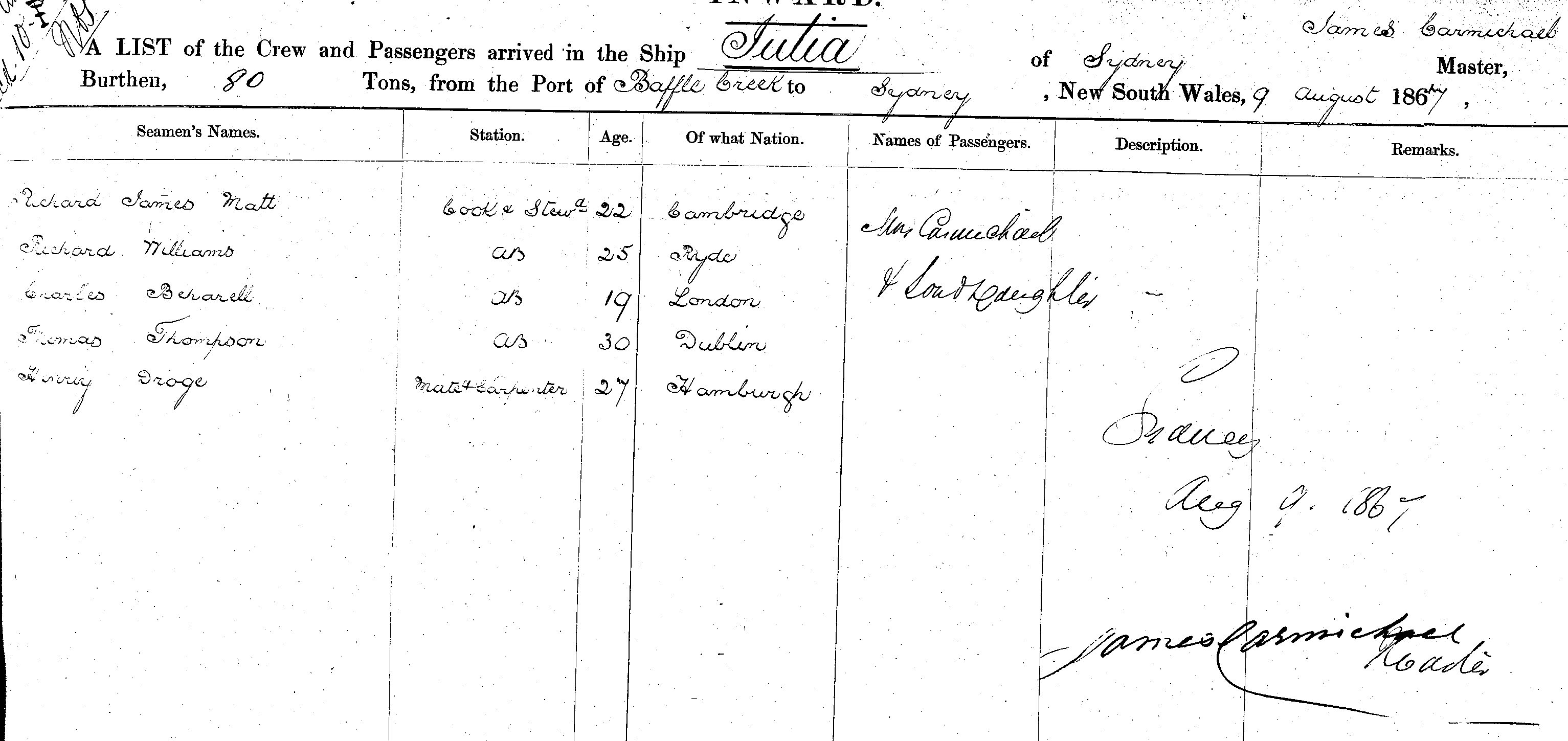 JULIASHIP OF SYDNEY, JAMES CARMICHAEL , MASTER, BURTHEN 80 TONS FROM THE PORT OF BAFFLE CREEK, TO SYDNEY, NEW SOUTH WALES, 9TH AUGUST 1867 |