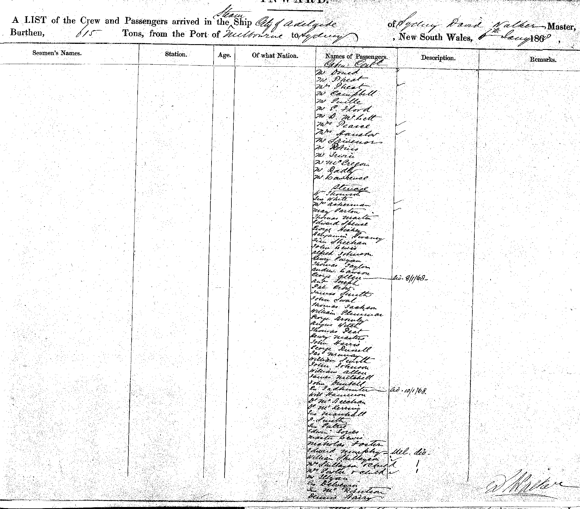 CITY OF ADELAIDEOF SYDNEY, DAVID WALKER, MASTER, BURTHEN 615 TONS FROM THE PORT OF MELBOURNE TO SYDNEY, NEW SOUTH WALES, 6TH JANUARY,1868 |