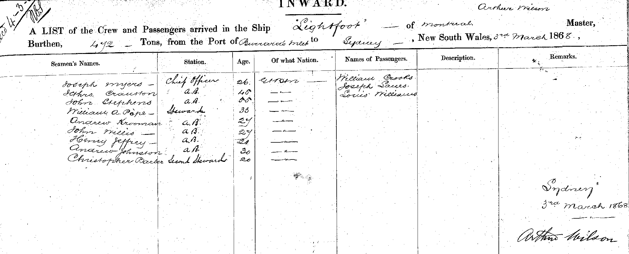 LIGHTFOOTOF MONTREAL, ARTHUR WILSON, MASTER, BURTHEN 472 TONS FROM THE PORT OF BURNARD'S MEET ?TO SYDNEY, NEW SOUTH WALES, 3RD MARCH 1868 |