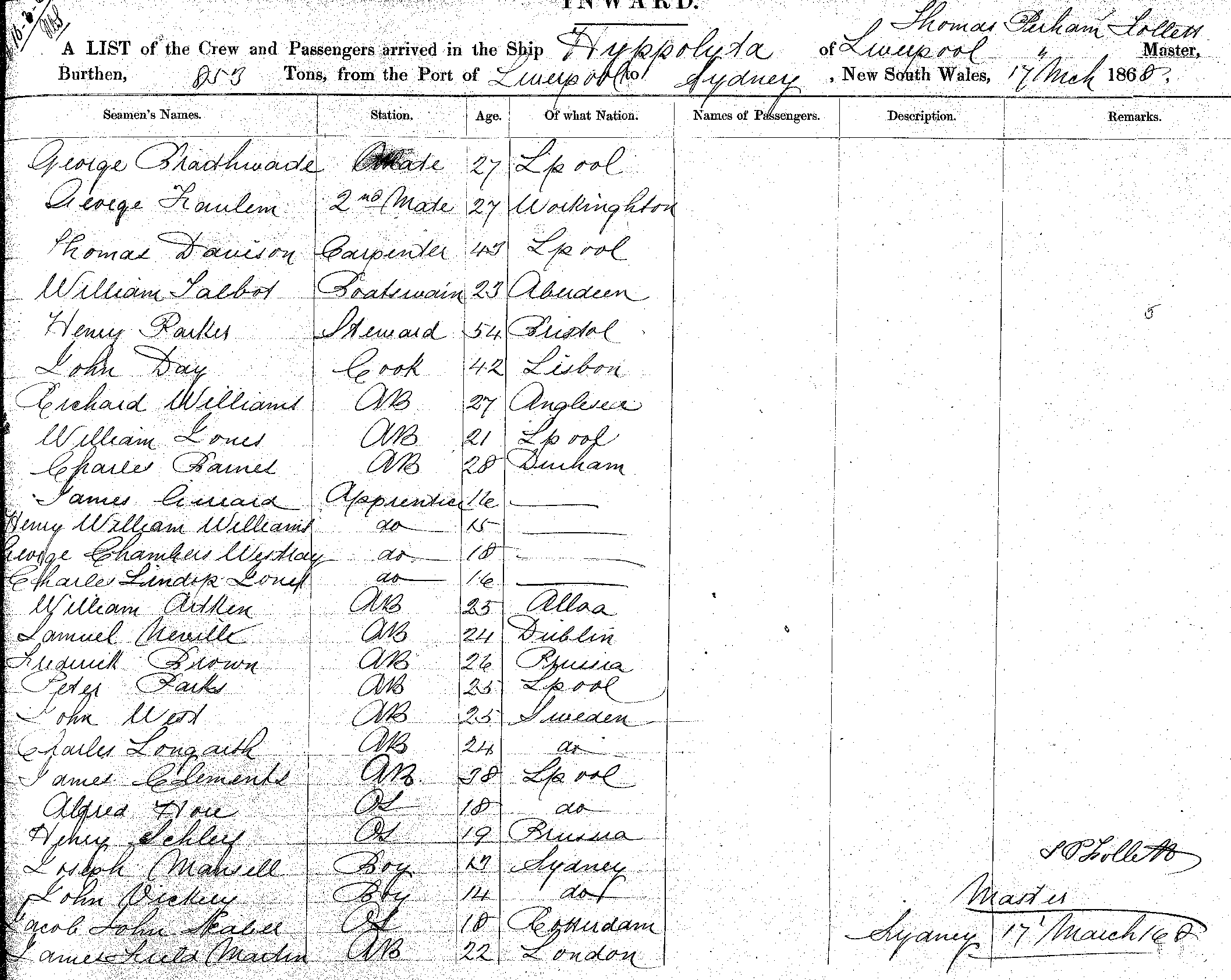 HYPPOLYTAOF LIVERPOOL, THOMAS PERHAM FOLLETT, MASTER, BUTHERN 85E TONS FROM THE PORT OF LIVERPOOL TO SYDNEY, NEW SOUTH WALES, 17TH MARCH, 1868 |