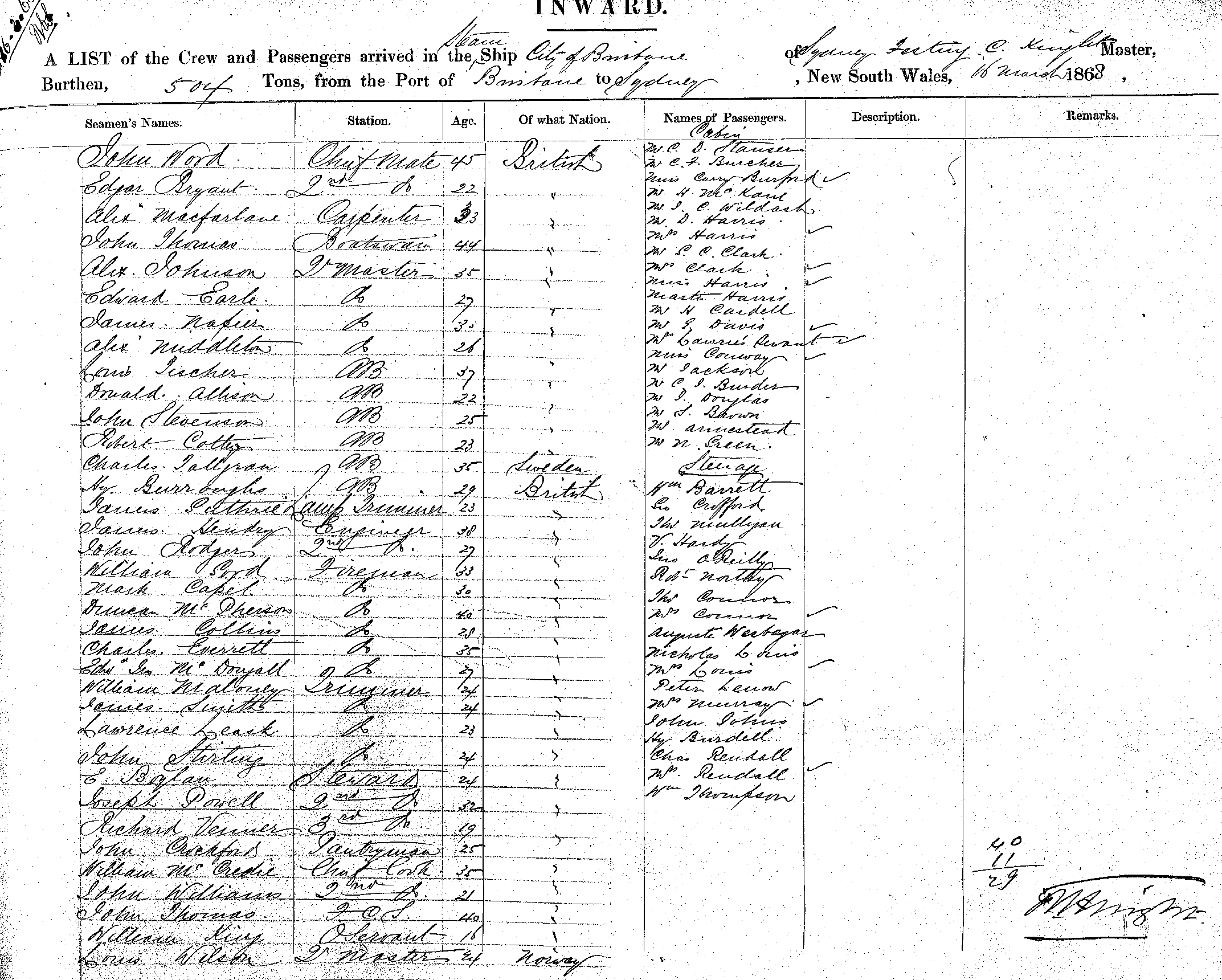 CITY OF BRISBANEOF SYDNEY, FESTING C. KNIGHT, MASTER, BURTHEN 504 TONS FROM THE PORT OF BRISBANE TO SYDNEY, NEW SOUTH WALES, 16TH MARCH, 1868 |