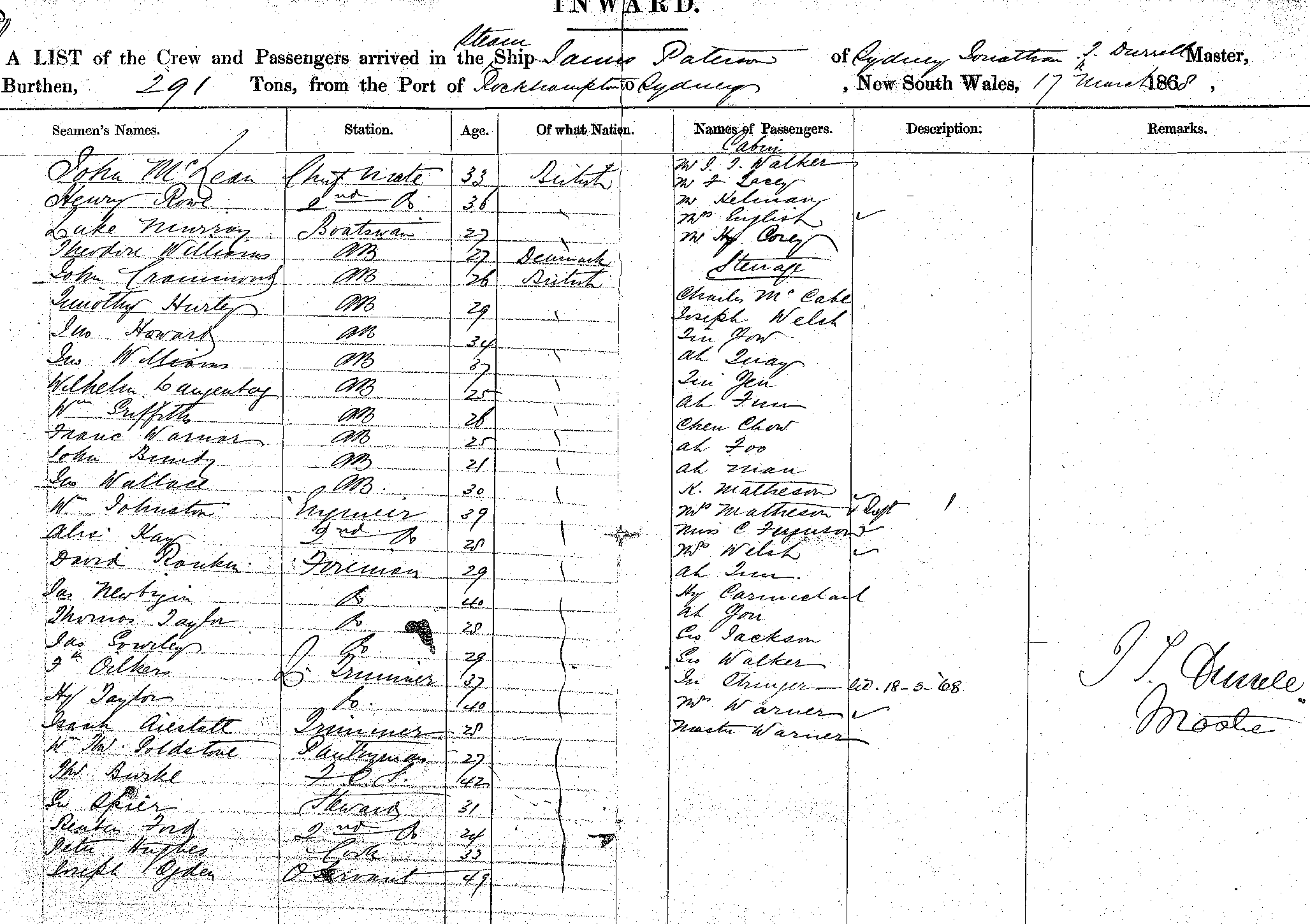 JAMES PATERSON OF SYDNEY, JONATHAN J DURRELL, MASTER, BURTHEN 291 TONS FROM THE PORT OF ROCKHAMPTON TO SYDNEY, NEW SOUTH WALES, 17TH MARCH, 1868 |