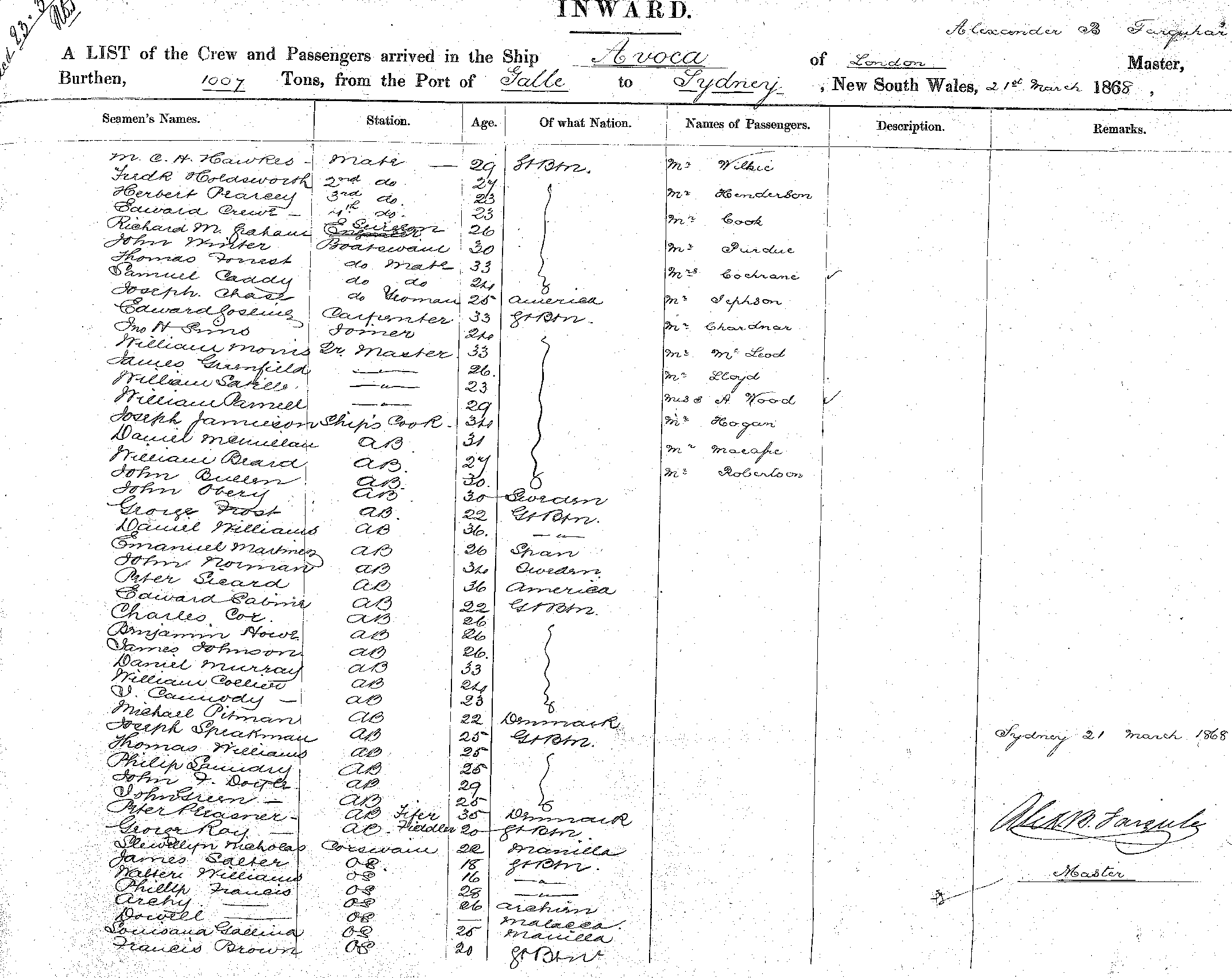 AVOCAOF LONDON, ALEXANDER.B.FARQUHAR, MASTER, BURTHEN 1007 TONS FROM THE PORT OF GALLE TO SYDNEY, NEW SOUTH WALES, 21ST MARCH, 1868 |