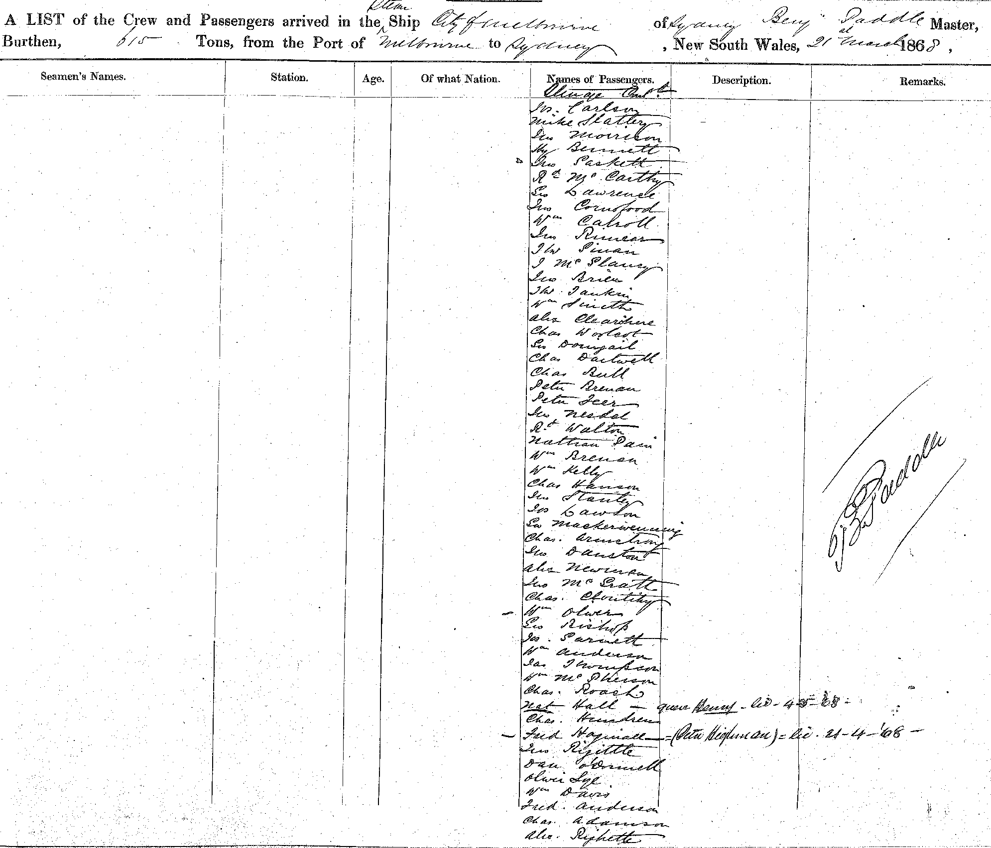 CITY OF MELBOURNEOF SYDNEY, BENJ PADDLE, MASTER, BURTHEN 615 TONS FROM THE PORT OF MELBOURNE TO SYDNEY, NEW SOUTH WALES, 21ST MARCH, 1868 |