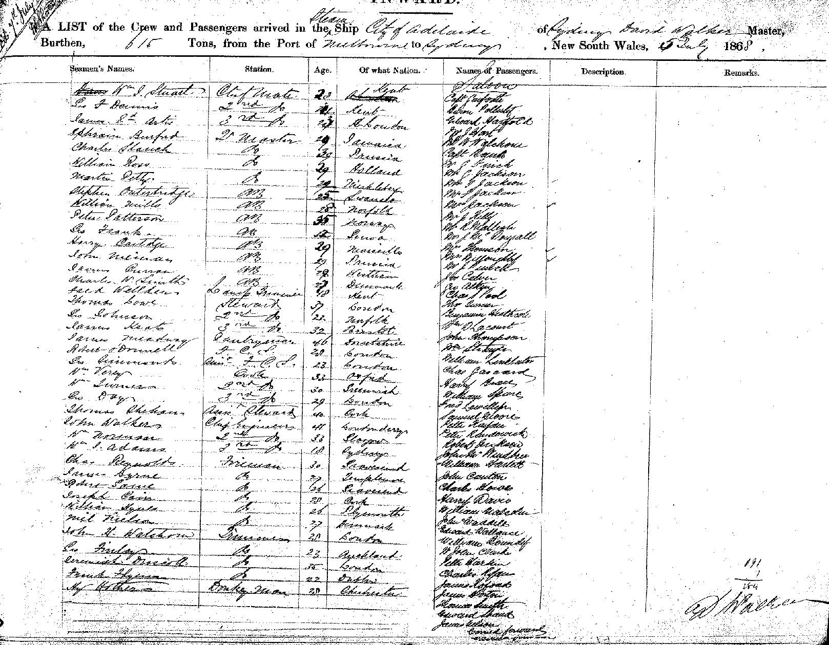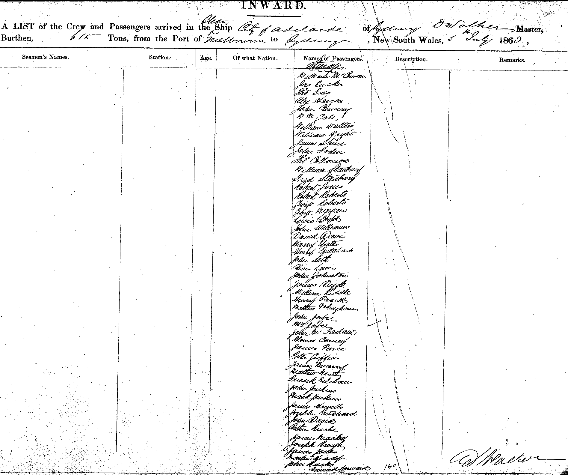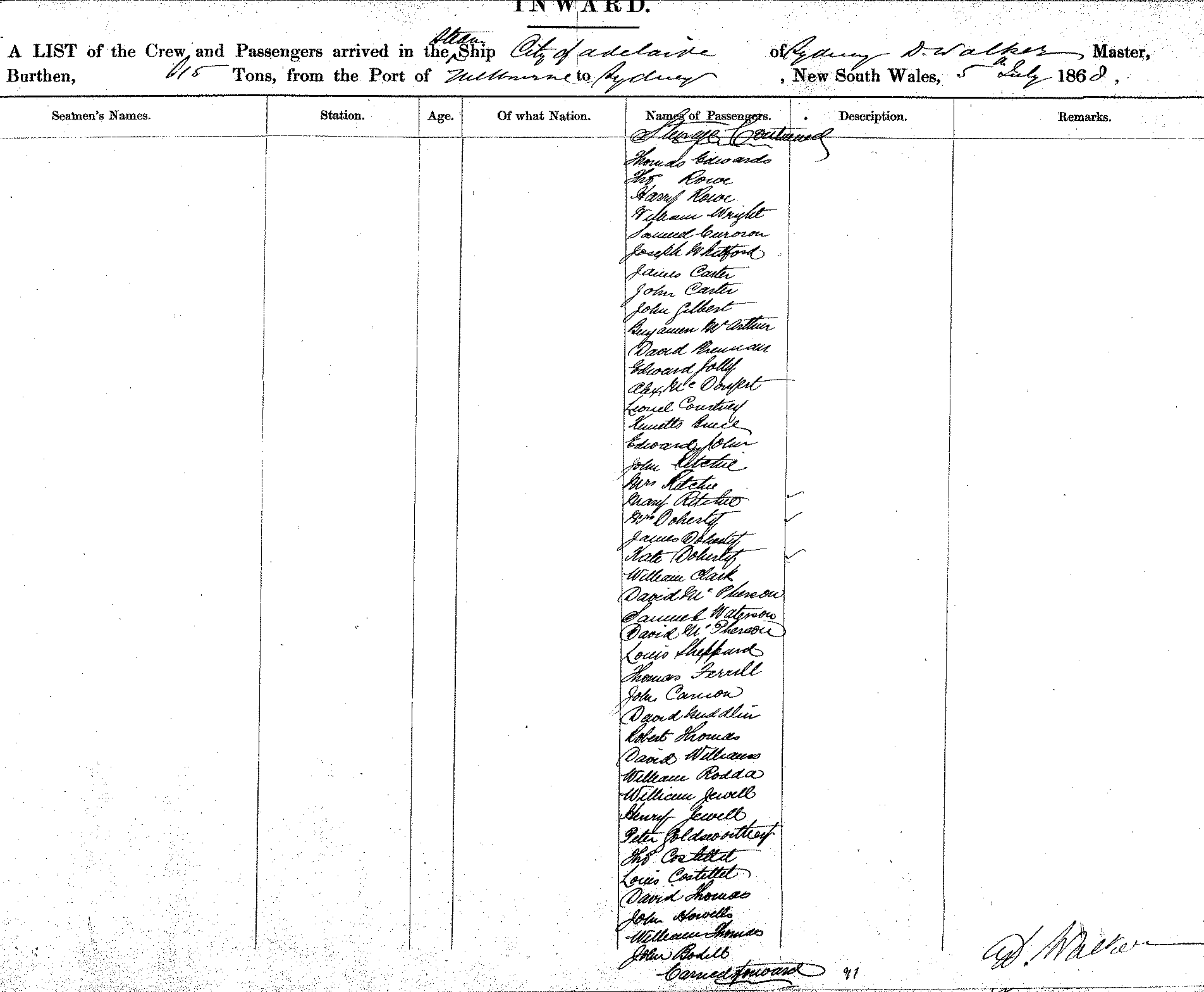CITY OF ADELAIDEOF SYDNEY. DAVID WALKER, MASTER, BURTHEN 615 TONS FROM THE PORT OF MELBOURNE TO SYDNEY 6TH JULY, 1868 |