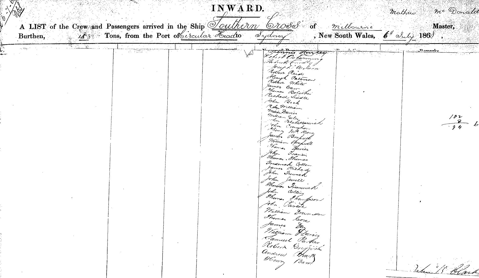 SOUTHERN CROSSOF MELBOURNE, MATHEW MACDONALD MASTER BURTHEN OF158 TONS FROM THE PORT OF CIRCULAR HEAD TO SYDNEY, 6TH JULY, 1868 |