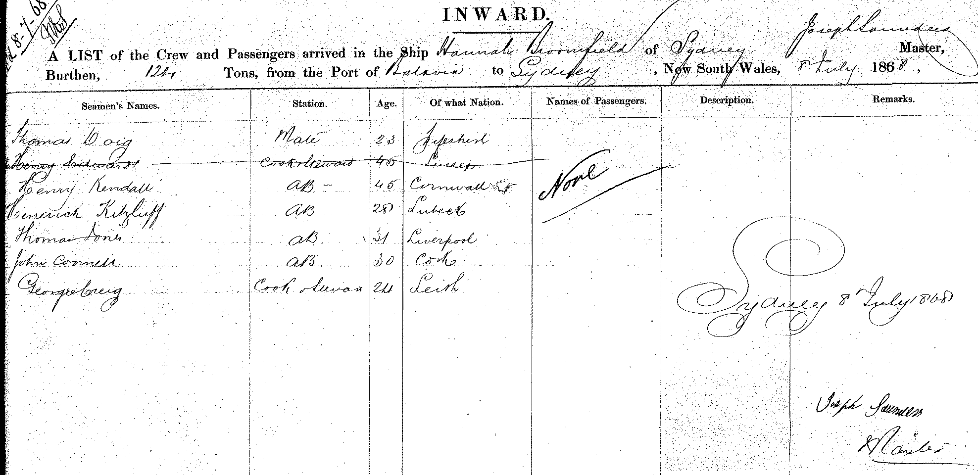 HANNAH BROOMFIELDOF SYDNEY, JOSEPH SAUNDERS, MASTER, BURTHEN 124 TONS FROM BATAVIA TO SYDNEY, NEW SOUTH WALES, 8TH JULY 1868 |