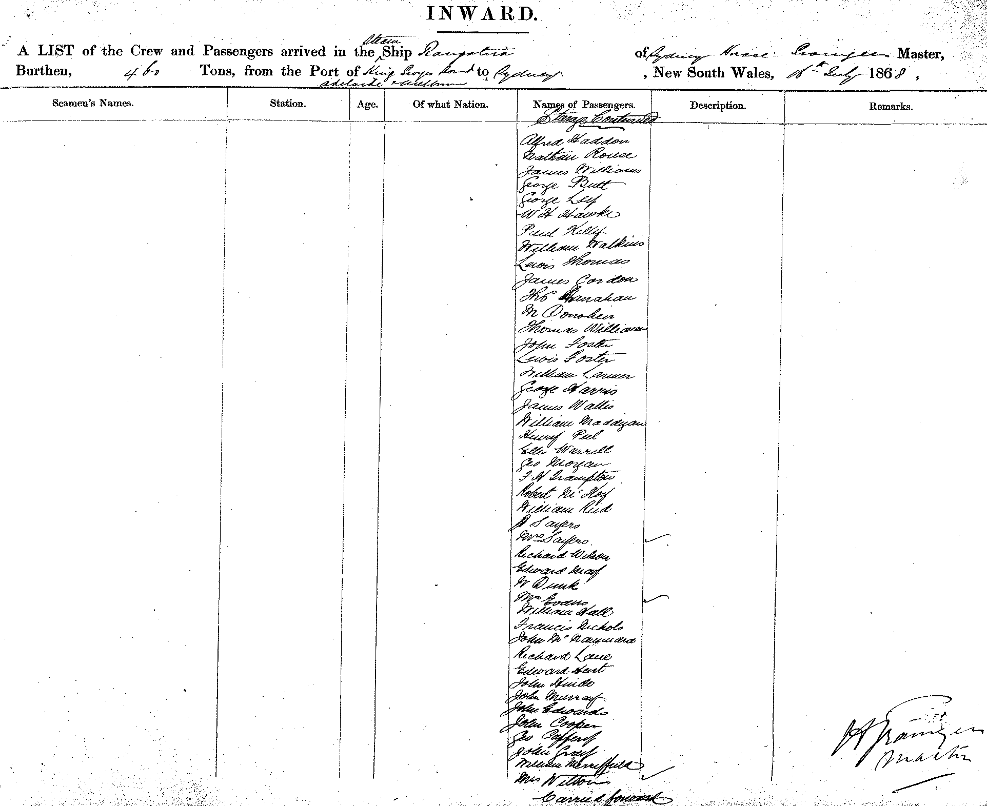 RANGATIRAOF SYDNEY, HORACE GRANGER, MASTER, BURTHEN 460 TONS FROM KING GEORGE'S SOUND, ADELAIDE, & MELBOURNE TO SYDNEY, NEW SOUTH WALES, 16TH JULY 1868 |
