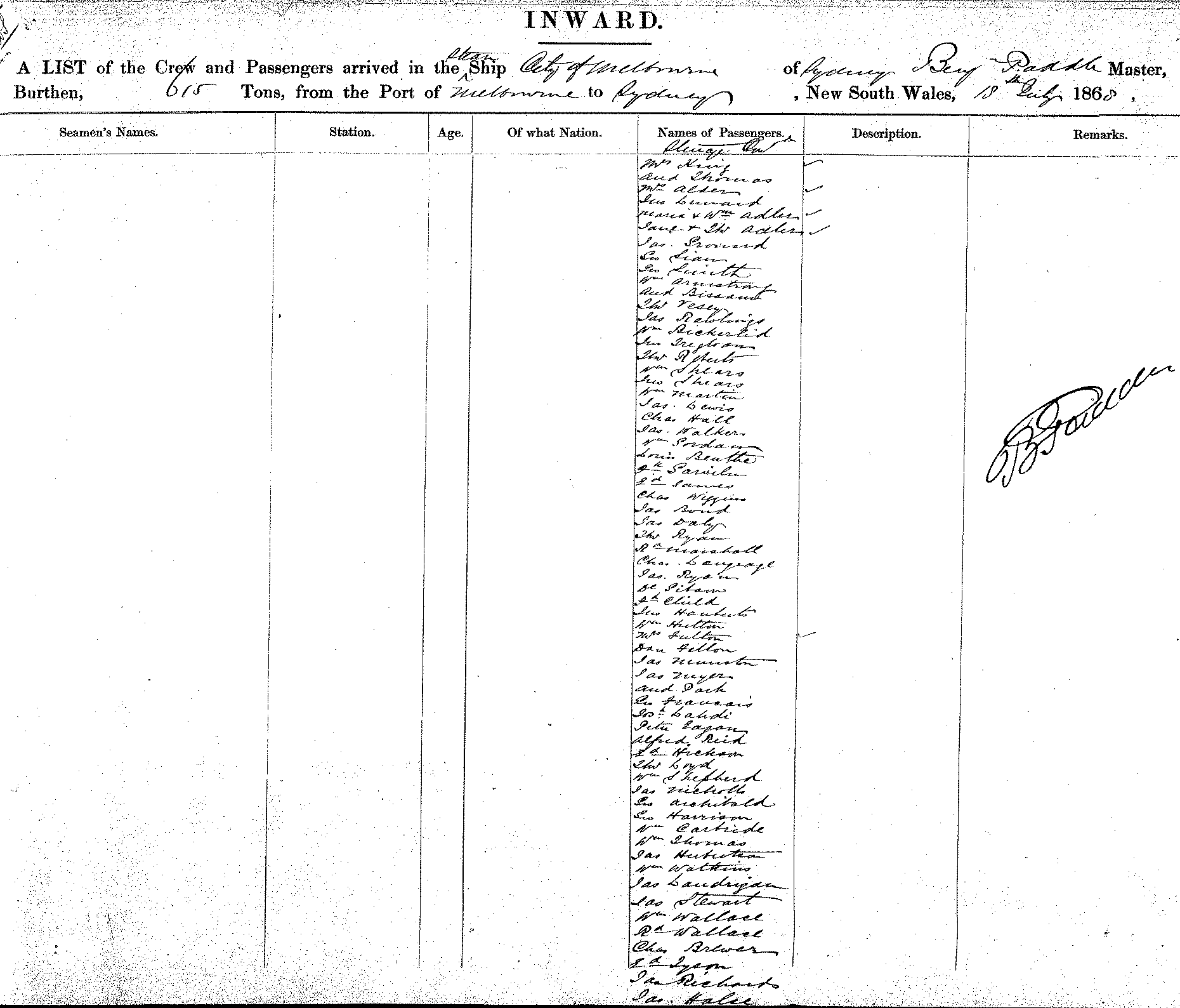CITY OF MELBOURNEOF SYDNEY, BENJ. PADDLE, MASTER, BURTHEN 615 TONS FROM MELBOURNE TO SYDNEY, NEW SOUTH WALES, 18TH JULY 1868 |