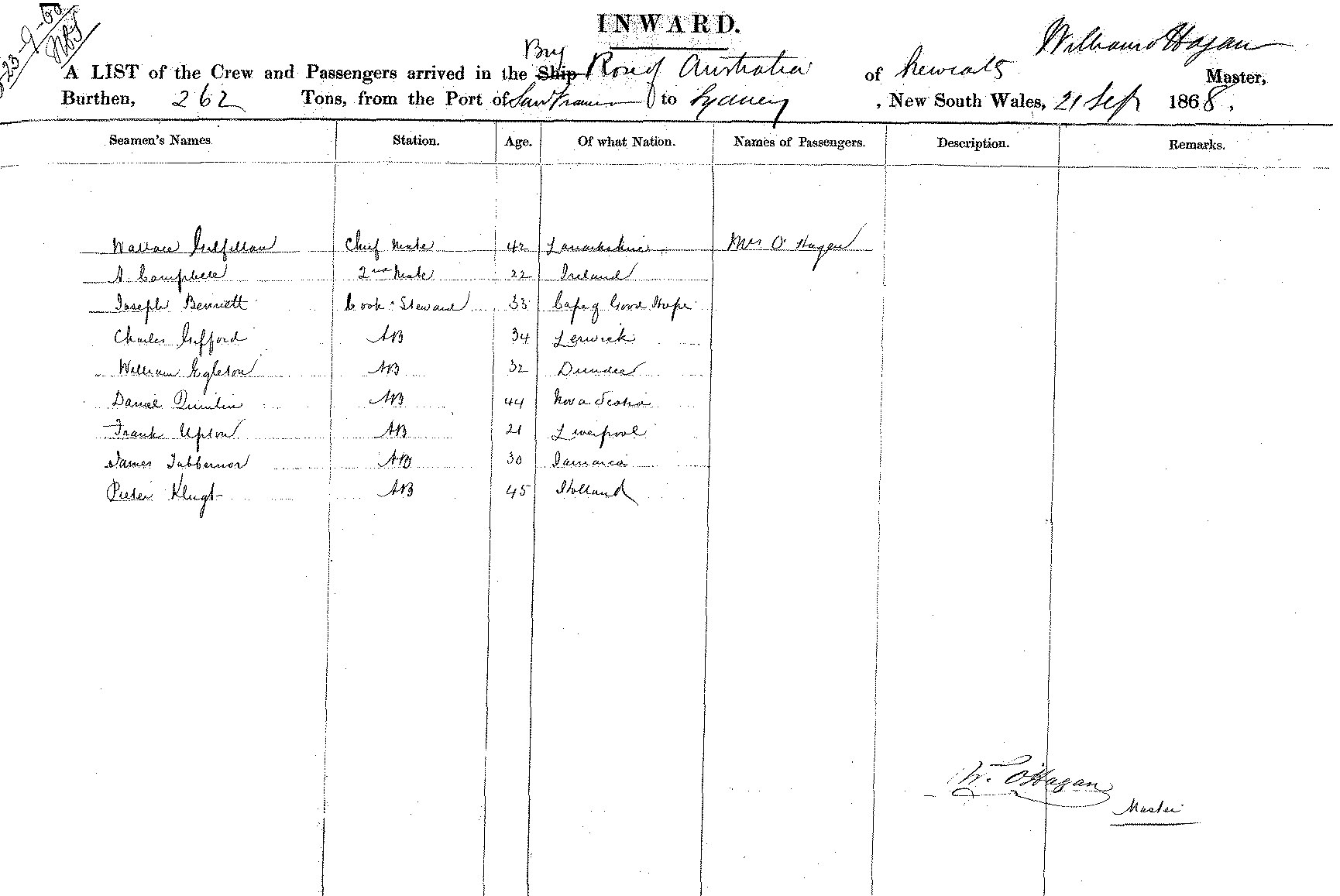 ROSE OF AUSTRALIABRIG OF NEWCASTLE, WILLIAM O'HAGAN, MASTER, BURTHEN 262 TONS FROM THE PORT OF SAN FRANCISCO TO SYDNEY, NEW SOUTH WALES, 21ST SEPTEMBER, 1868 |