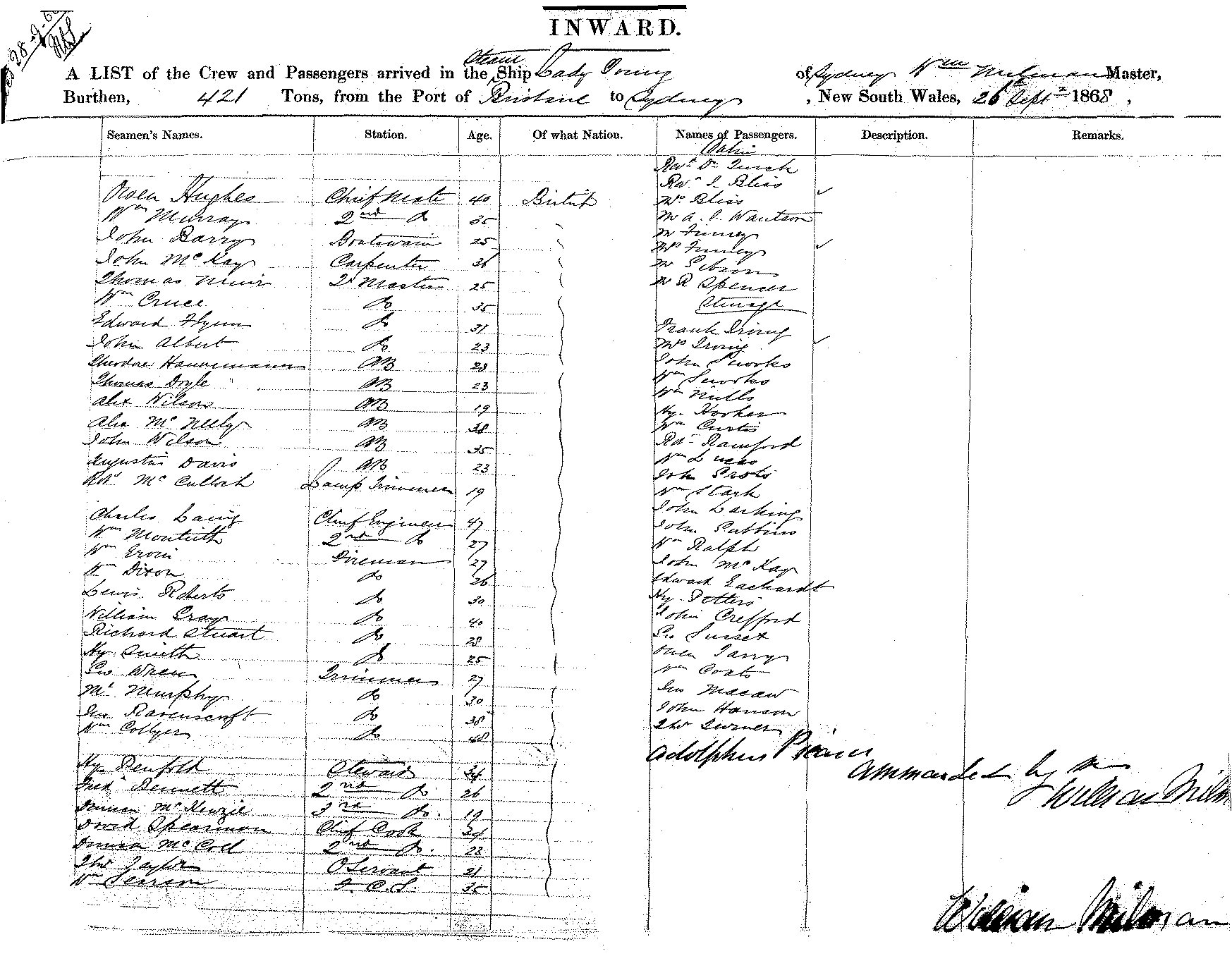 LADY YOUNGSTEAMSHIP OF SYDNEY, WILLIAM MILMAN, MASTER, BURTHEN 421 TONS FROM THE PORT OF BRISBANE TO SYDNEY, NEW SOUTH WALES, 26TH SEPTEMBER, 1868 |