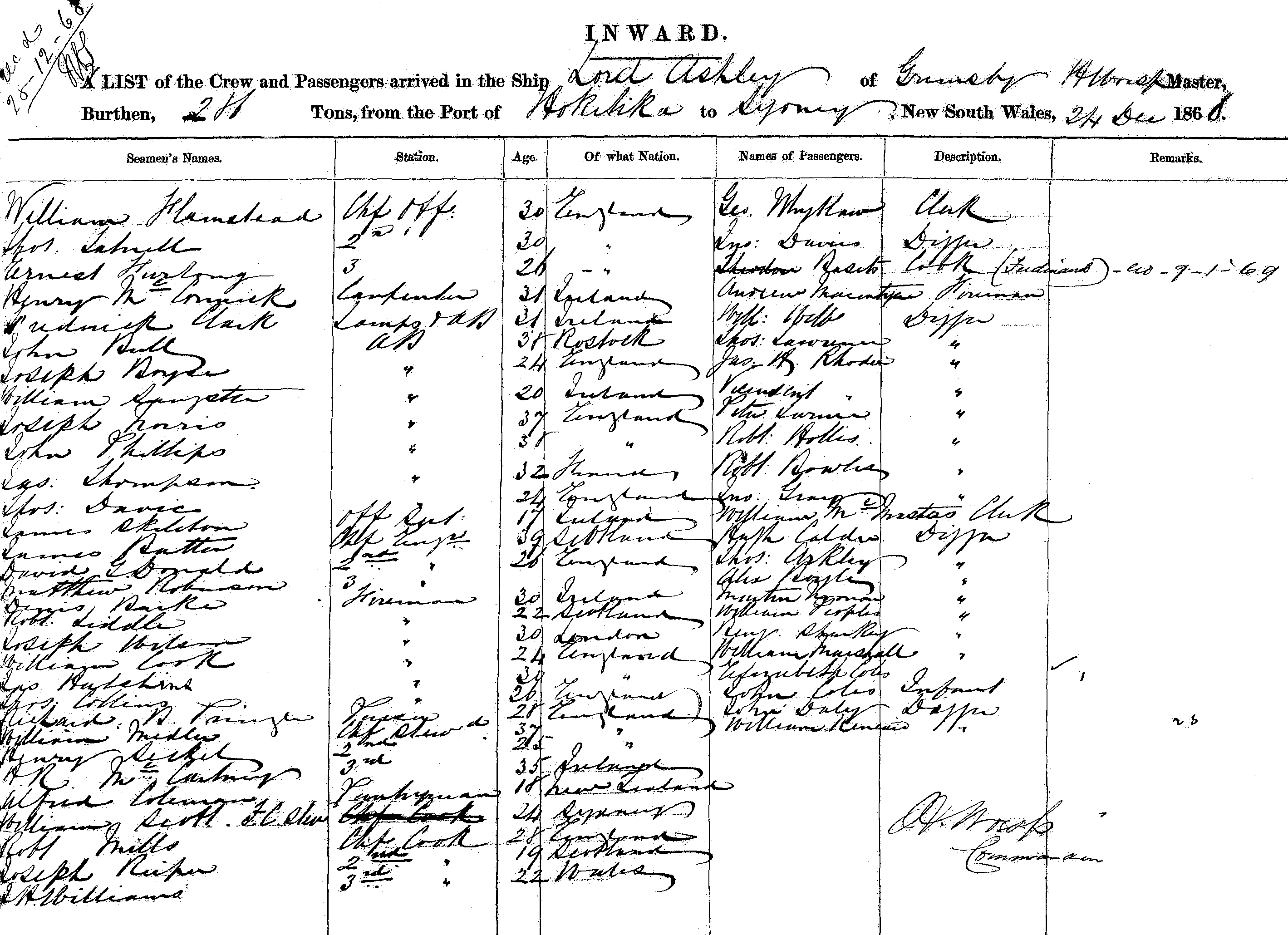 LORD ASHLEYOF GRIMSBY, H. MOSOP, MASTER, BURTHEN 286 TONS FROM THE PORT OF HOKITIKA TO SYDNEY, NEW SOUTH WALES, 24TH DECEMBER, 1868 |