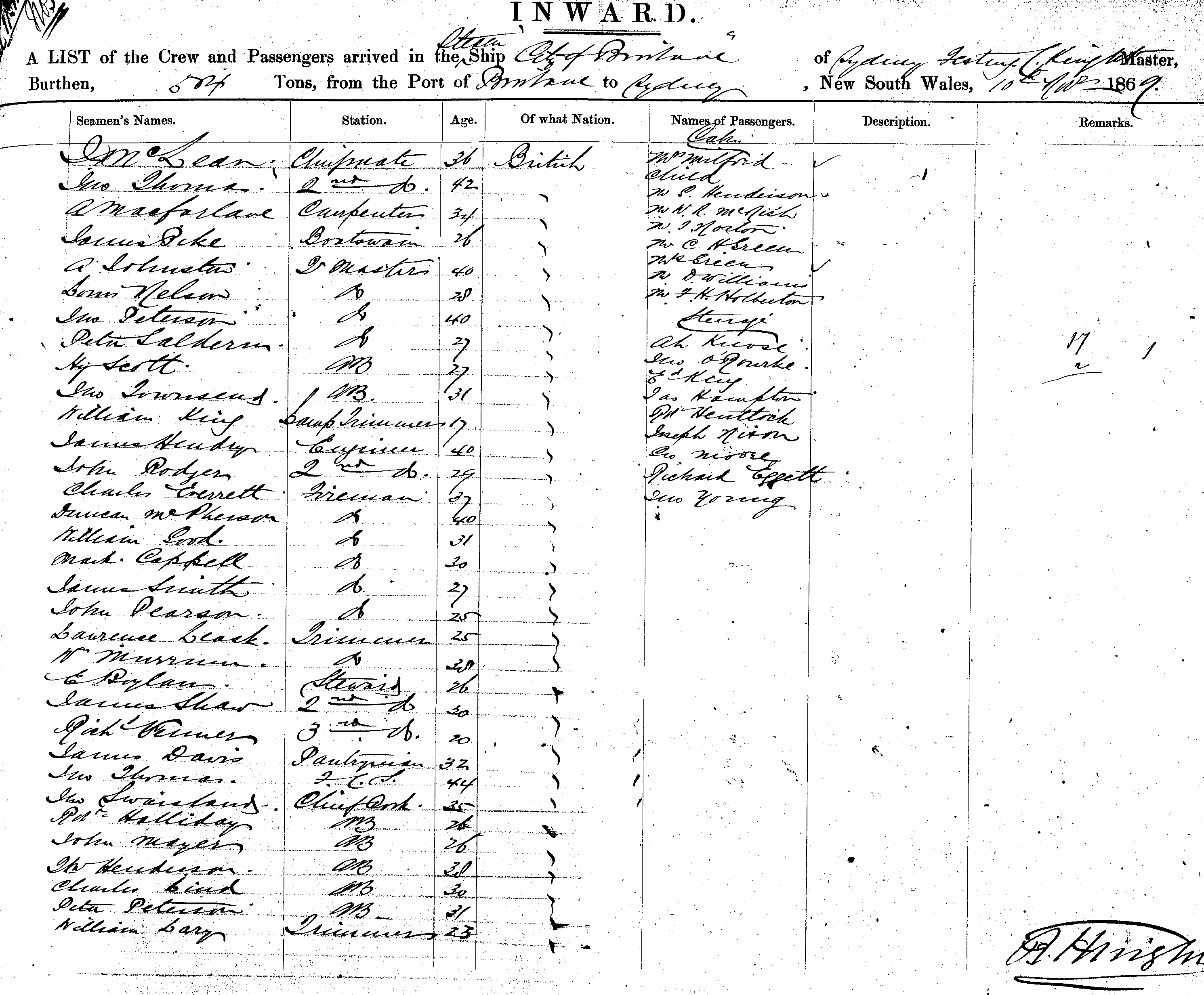 CITY OF BRISBANES. S. OF SYDNEY, FESTING C. KNIGHT, MASTER, BURTHEN 504 TONS FROM THE PORT OF BRISBANE TO SYDNEY, NEW SOUTH WALES, 10TH NOV. 1869 |