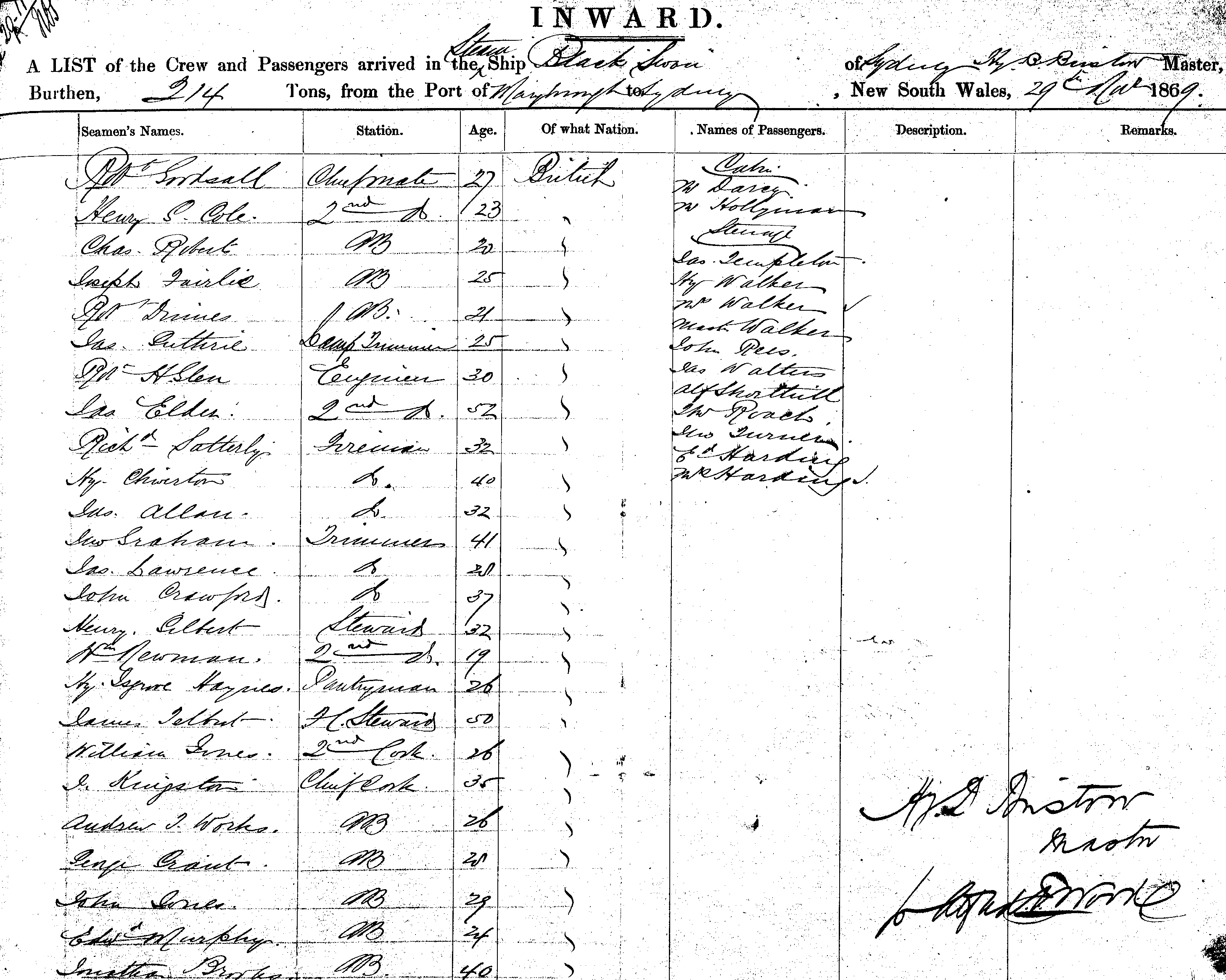 BLACK SWANOF SYDNEY, HY. B. BRISTOW, MASTER, BURTHEN 214 TONS FROM THE PORT OF MARYBOROUGH TO SYDNEY, NEW SOUTH WALES, 29TH NOV. 1869 |