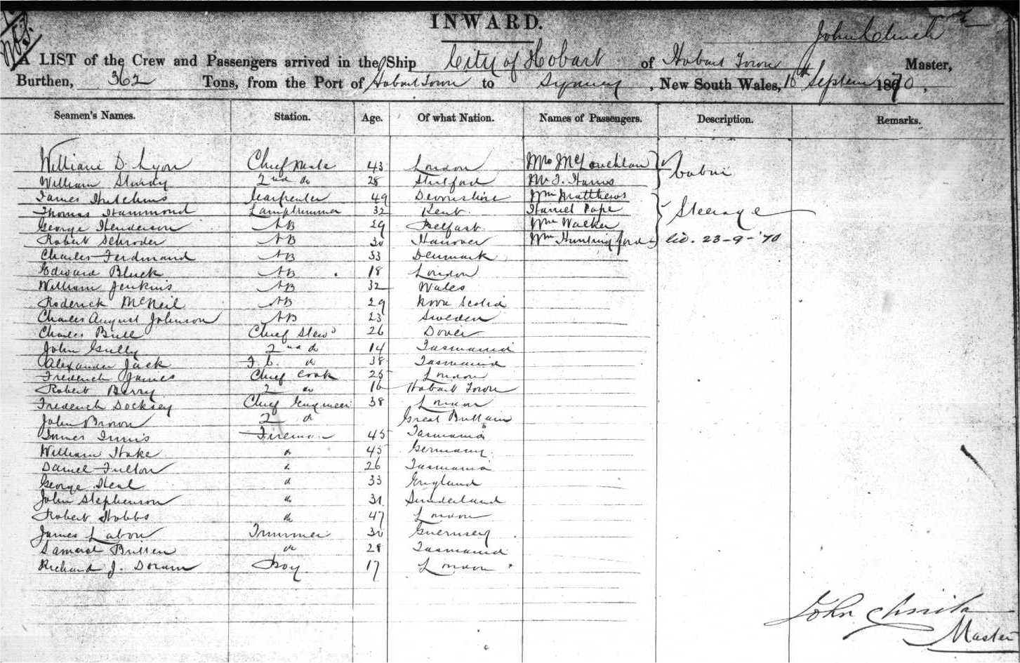 CITY OF HOBART.of Hobart town, JOHN CLINCH, Master, Burthen 362 Tons from the Port of HOBART TOWN to SYDNEY, New South Wales, 16th Sep 1870 |