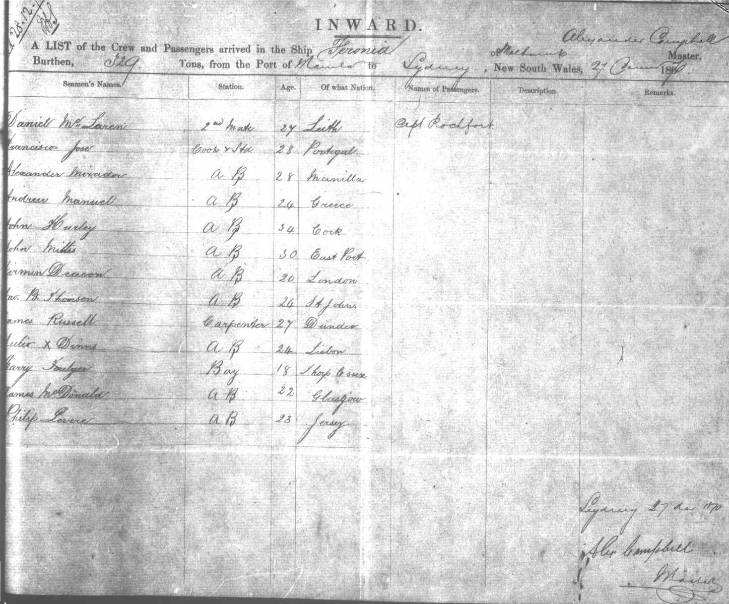 FERONIAOF MELBOURNE, ALEXANDER CAMPBELL, MASTER, BURTHEN 329 TONS, FROM THE PORT OF MAWEN ? TO SYDNEY, NEW SOUTH WALES, 27 DECEMBER 1870 |