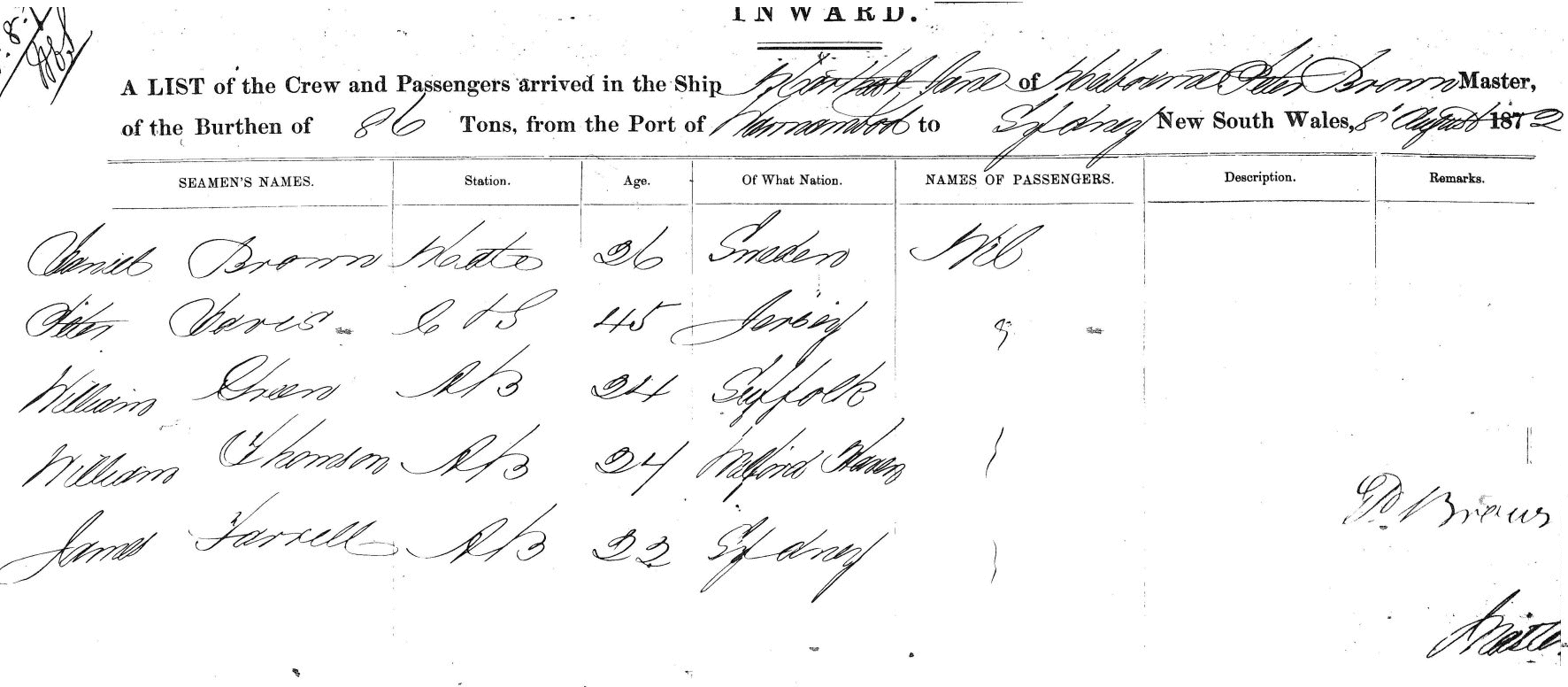 Source: State Records Authority of New South Wales: Shipping Master's Office; CGS 13278, Passengers Arriving 1855 - 1922; X126- 127 SR Reel 427, 1872.   Transcribed by Mary-Anne Warner, September, 1999.
