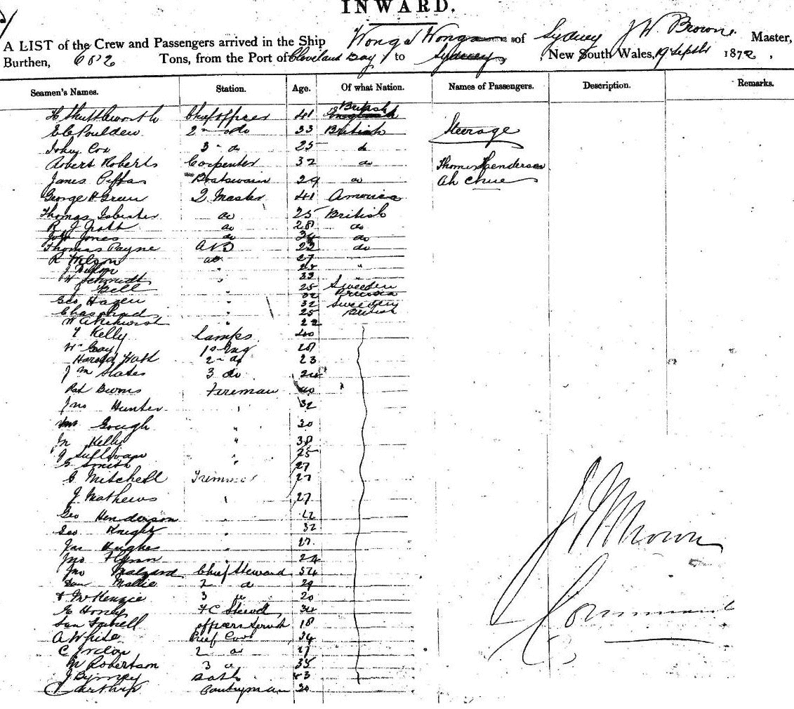 Source: State Records Authority of New South Wales: Shipping Master's Office; CGS 13278, Passengers Arriving 1855 - 1922; X128-129, SR Reel 428, 1872.   Transcribed by Elizabeth Lopez, 2001.