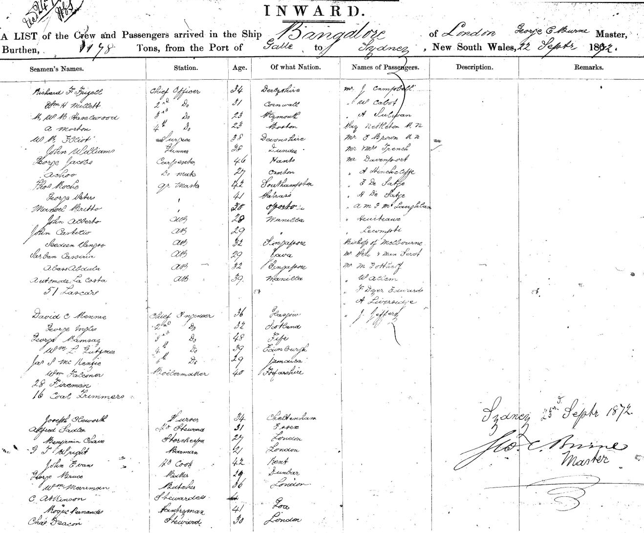 from the Port of GALLE to SYDNEY, New South Wales, 22nd September, 1872
