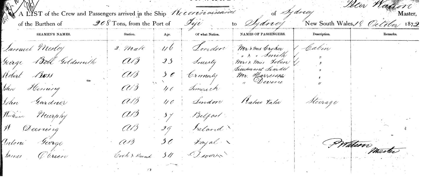 from FIJI to SYDNEY, New South Wales, 18th October, 1872