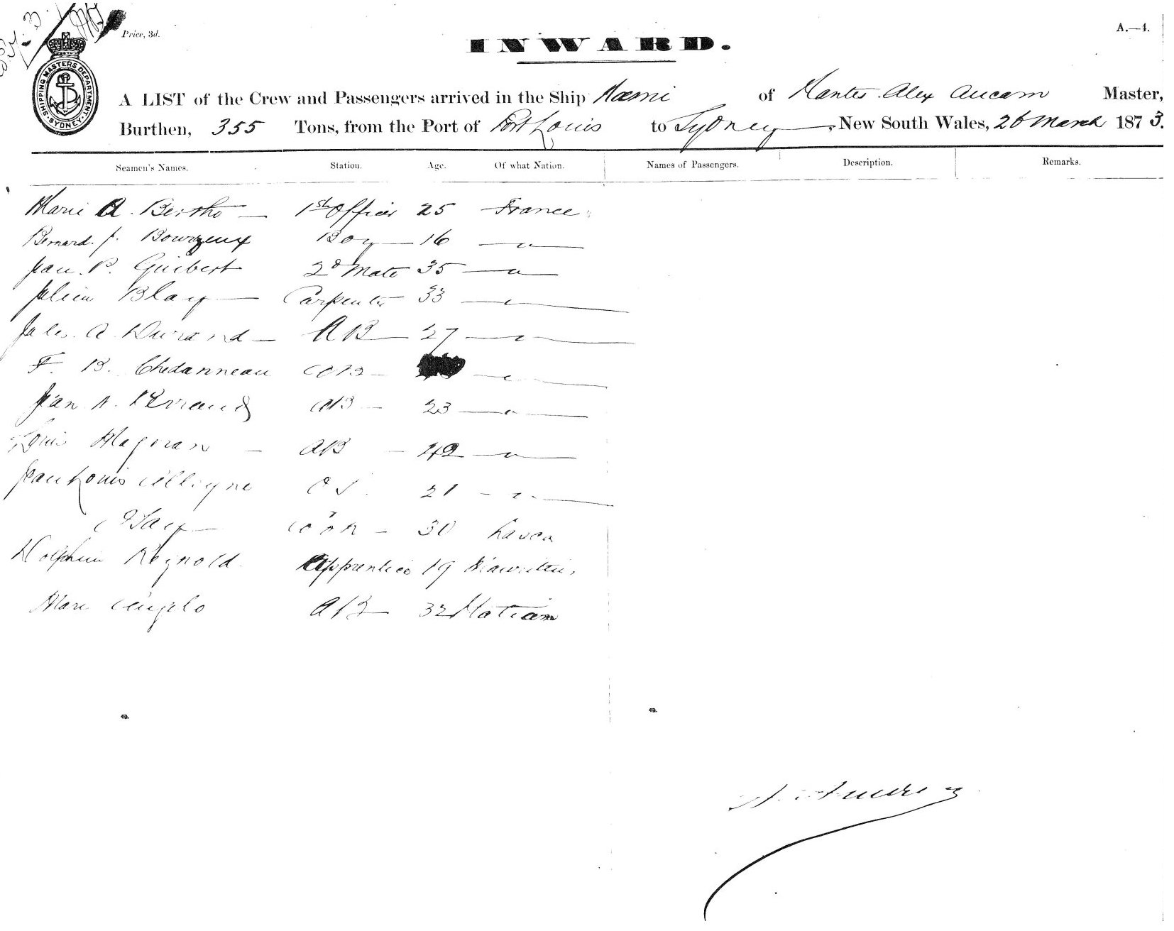 Source: State Records Authority of New South Wales: Shipping Master's Office; NGS 13278, Passengers Arriving 1855 - 1922; [X128-129] Reel 427 - 428. Transcribed by Mary-Anne Warner, November, 1999. You may view/print a scan of the original list - a monitor set to high resolution is recommended for clarity. Use your back button to return. Modifications made to scans: In some instances, text was enhanced - there was still an occasional name or list which defied this effort to read it; the Master's signature is usually found at the bottom right corner of the page; some pages have been shortened; excessive black markings have been removed. The last two mods. were to enable the fastest possible display in your browser. |