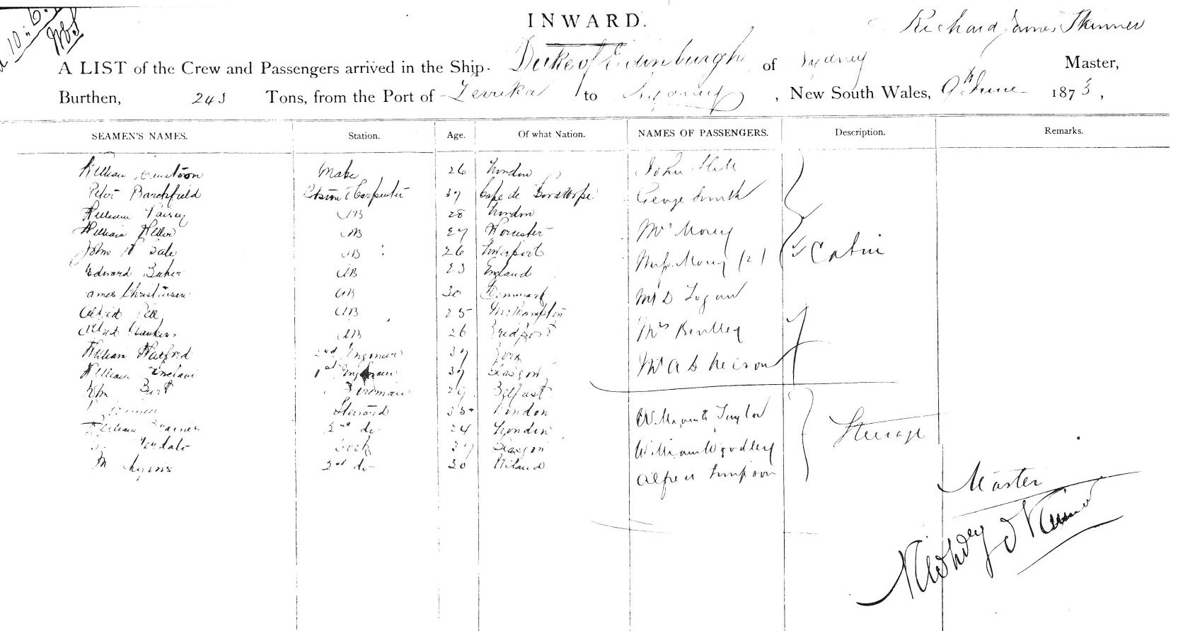 Source: State Records Authority of New South Wales: Shipping Master's Office; CGS 13278, Passengers Arriving 1855 - 1922; X129-130, SR Reel 429, 1873.   Transcribed by Mary-Anne Warner, September, 1999.