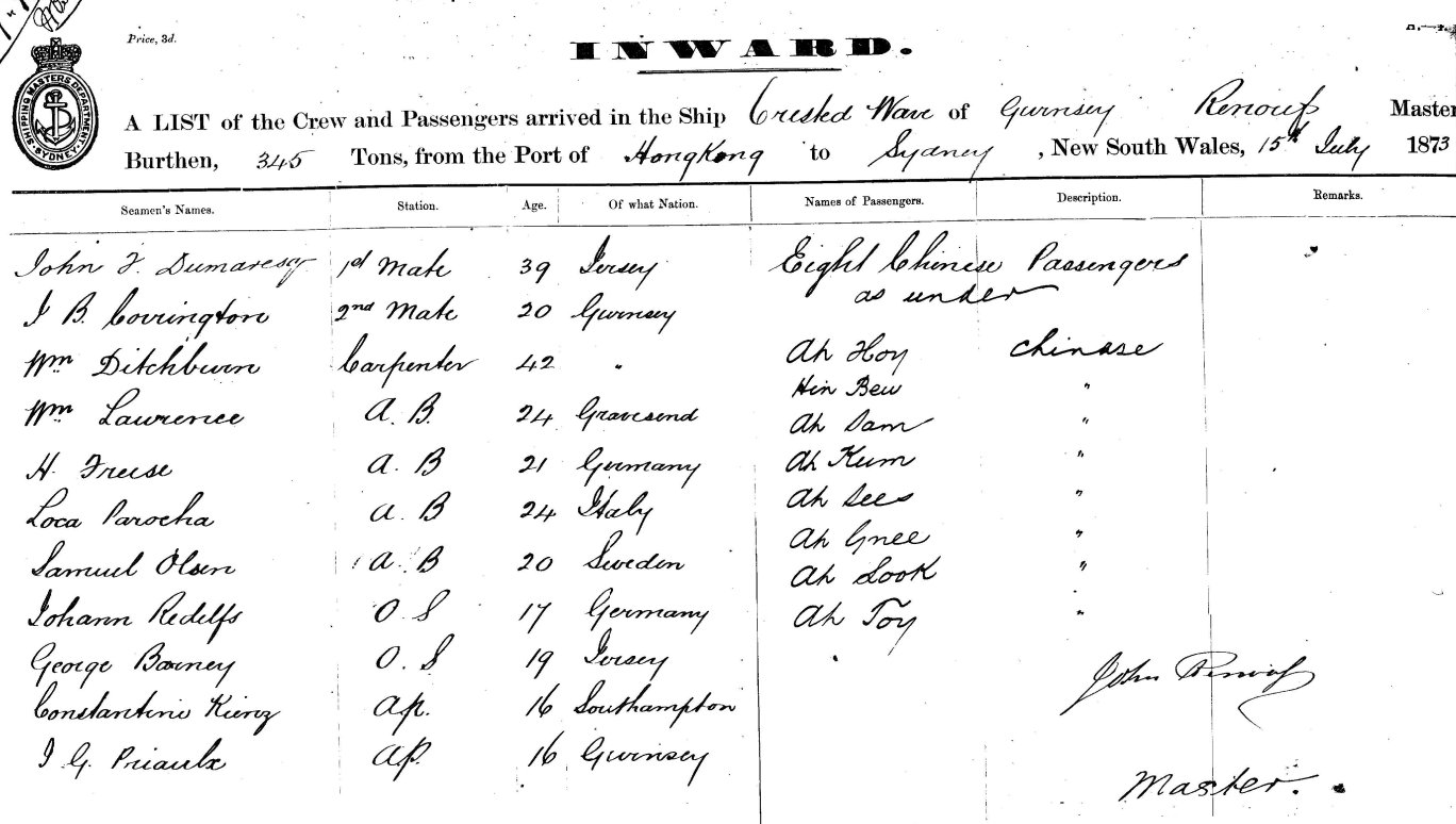 from the Port of HONG KONG to SYDNEY, New South Wales, 15th July, 1873
