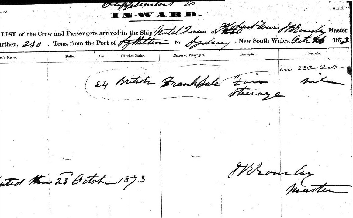 SALE FRANK   24 BRITISH PASSENGER STEERAGE LIC. 23 OCT.