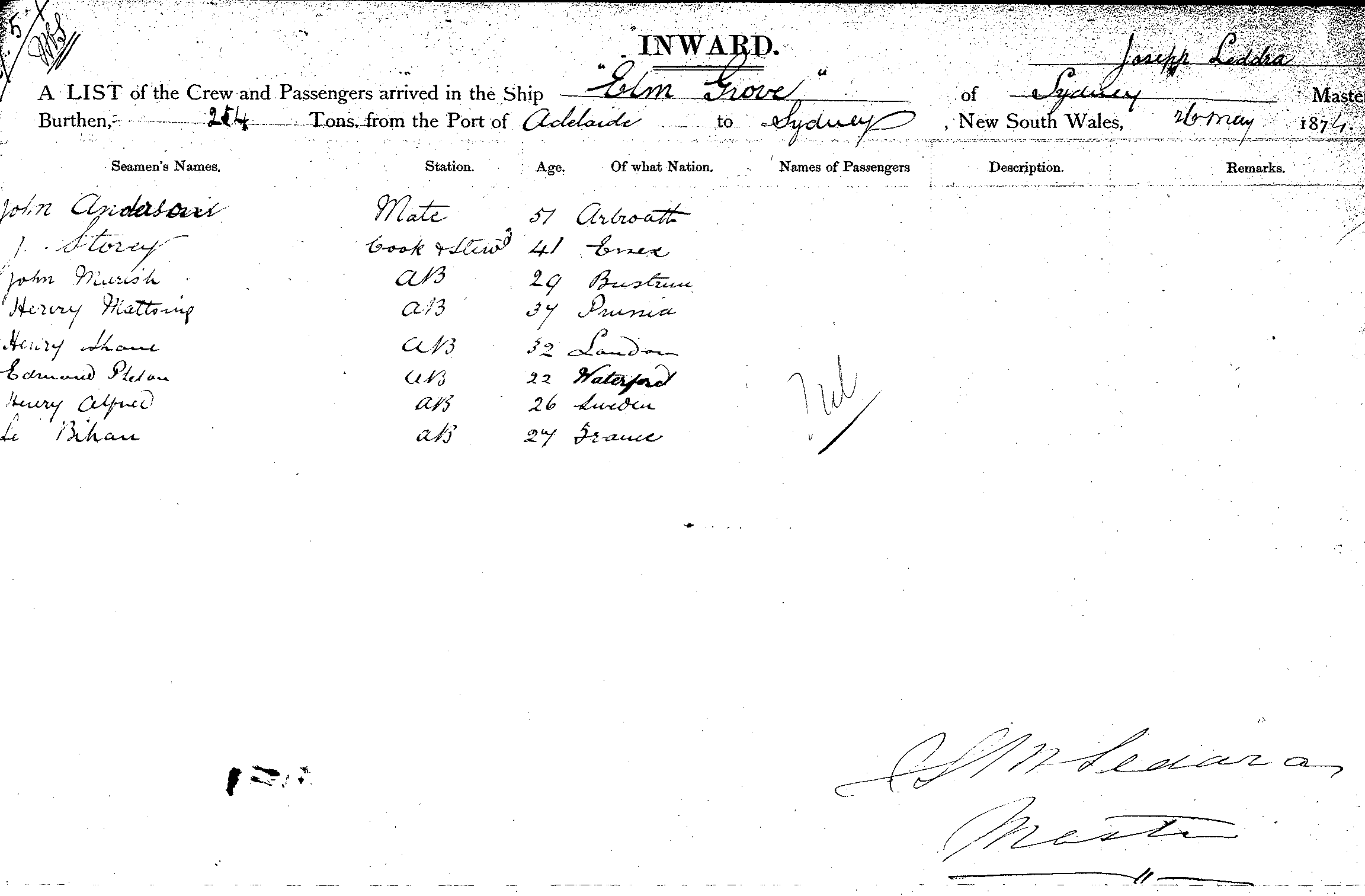 ELM GROVEOF SYDNEY, JOSEPH LEDDRA MASTER, 254 TONS FROM THE PORT OF ADELAIDE TO SYDNEY NEW SOUTH WALES, 26th MAY 1874 |