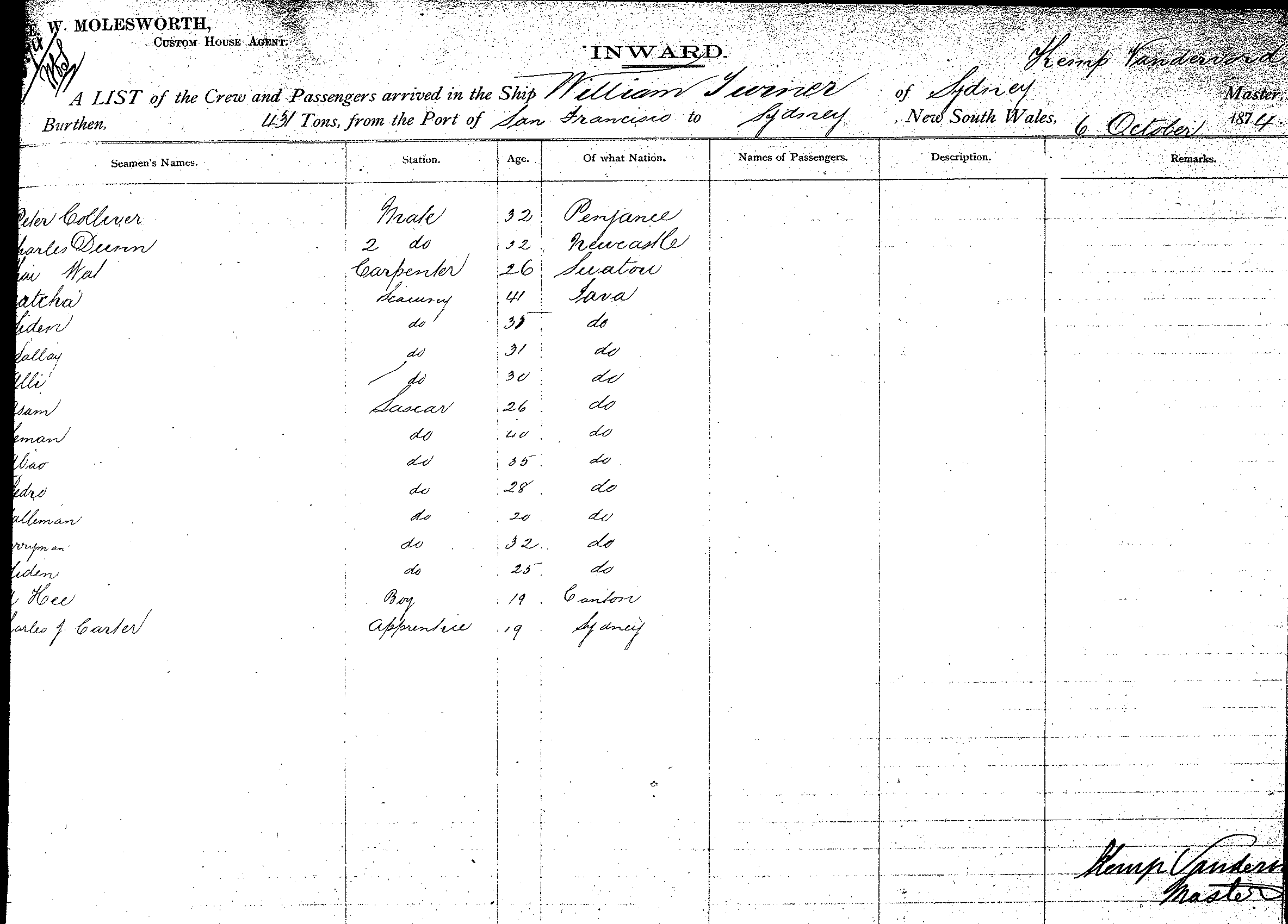 WILLIAM TURNEROF SYDNEY, KEMP VANDERVORD, MASTER, BURTHEN, 431 TONS, FROM THE PORT OF SAN FRANISCO TO SYDNEY, NEW SOUTH WALES, 6TH OCTOBER 1874 |