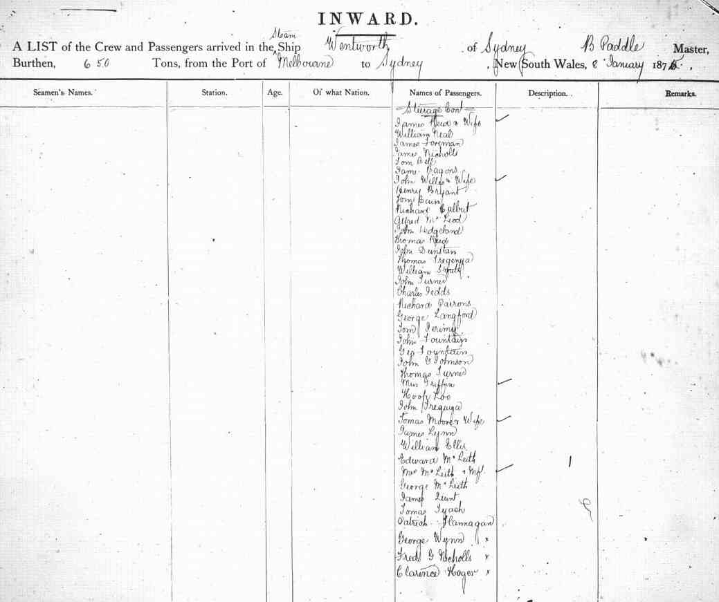 WENTWORTHOF SYDNEY, B PADDLE, MASTER, BURTHEN, 650 TONS FROM THE PORT OF MELBOURNE TO SYDNEY, NEW SOUTH WALES, 8TH JANUARY, 1875 |