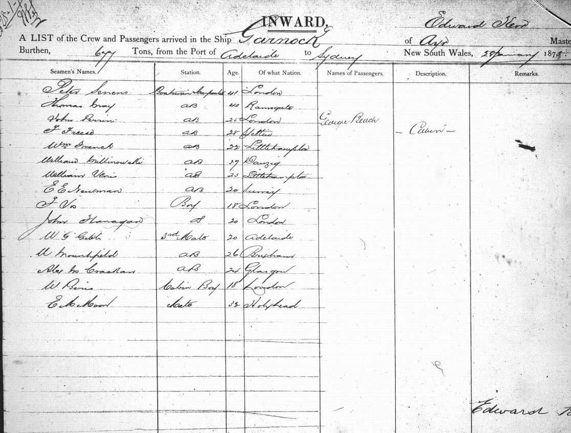 GARNOCKOF AYR, EDWARD KERR, MASTER, BURTHEN 677 TONS FROM THE PORT OF ADELAIDE TO SYDNEY, NEW SOUTH WALES, 28TH JANUARY, 1875 |