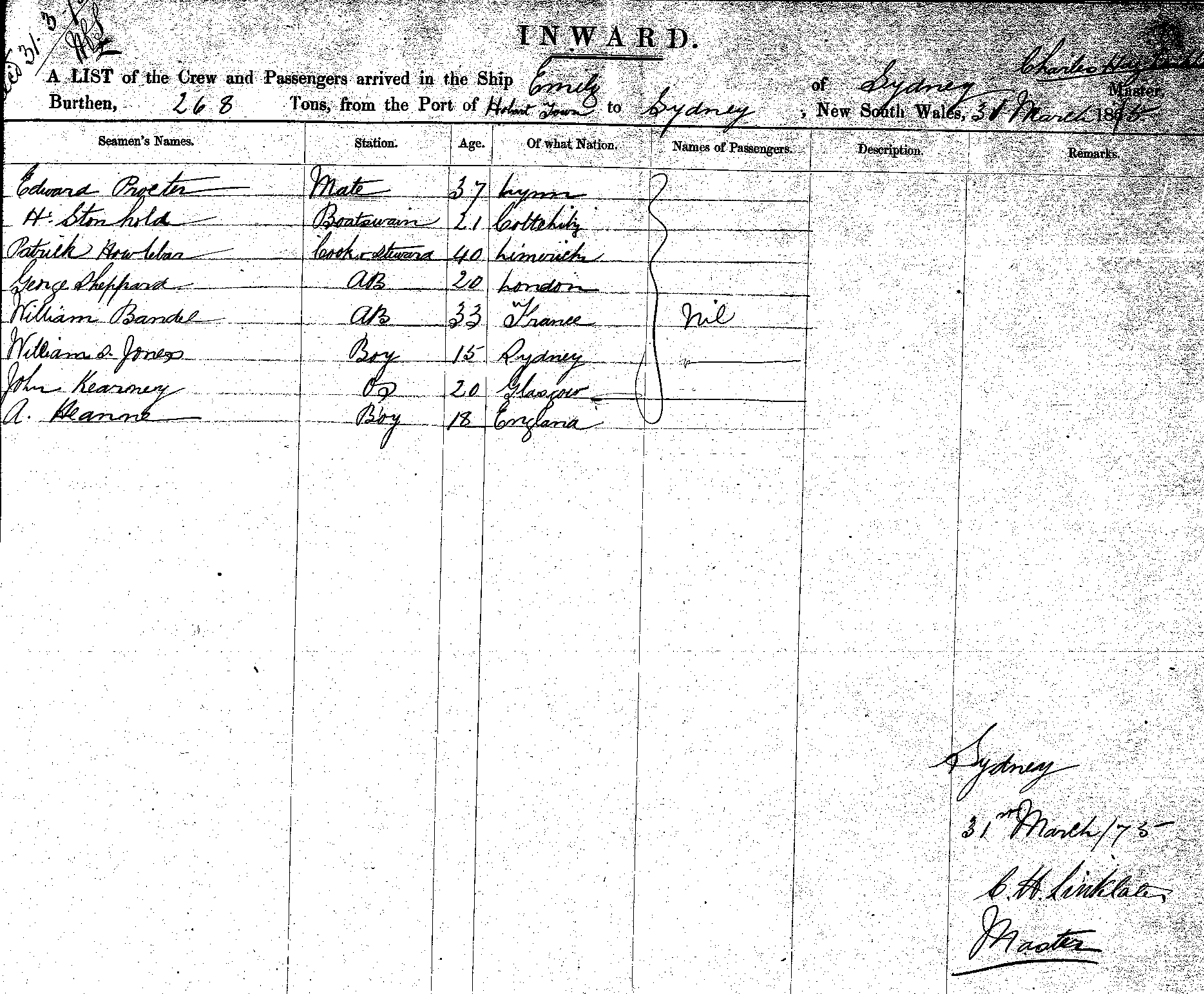 Emilyof Sydney, Charles Hay Linklater, Master, Burthen 268 tons from the Port of Hobart Town to Sydney, New South Wales, 31st March 1875 |