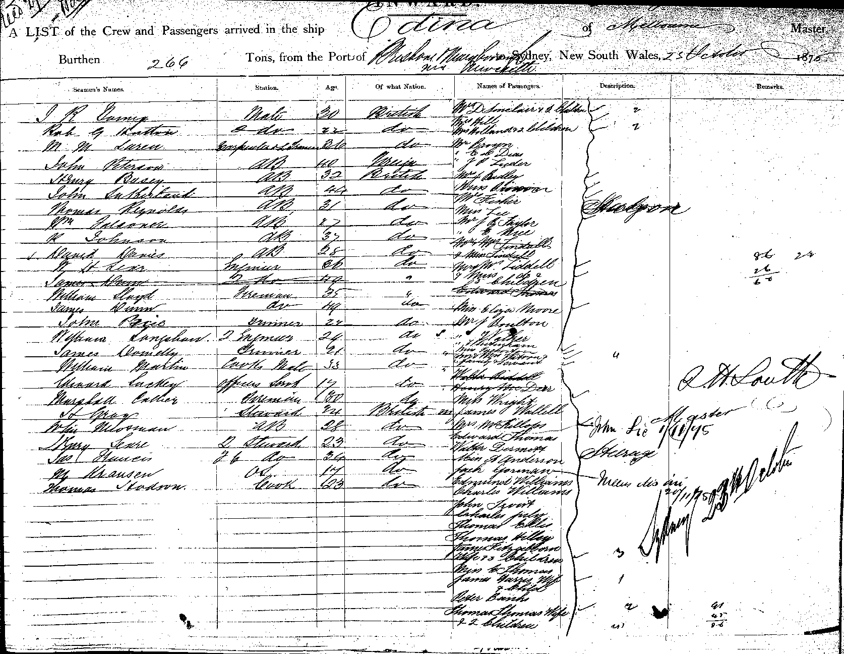 EDINAOF MELBOURNE, J.W. SOUTH MASTER, BURTHEN 266 TONS FROM THE PORT OF BRISBANE, MARYBOROUGH VIA NEWCASTLE TO SYDNEY, NEW SOUTH WALES, 23RD OCTOBER 1875 |