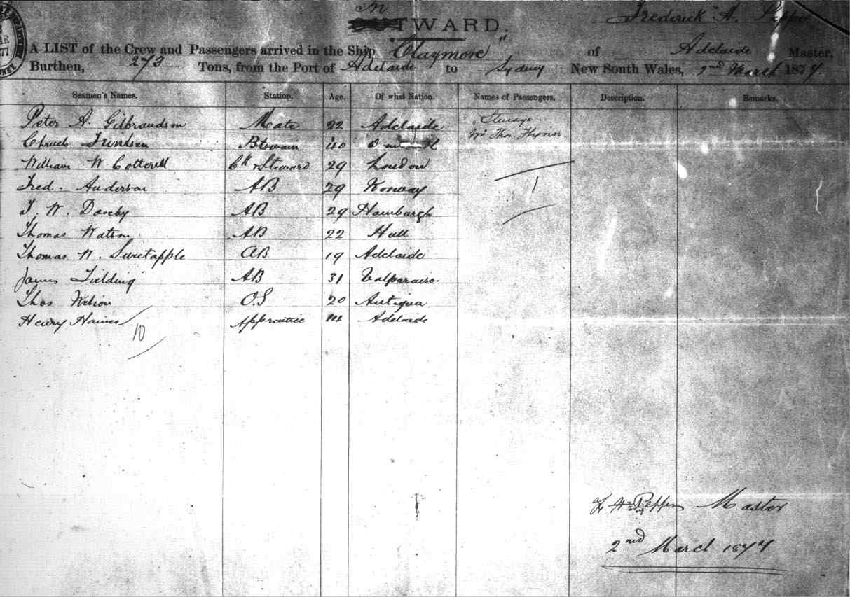 CLAYMOREof Adelaide, FREDERICK H. PEPPER, Master, Burthen 273 Tons from the Port of ADELAIDE to SYDNEY, New South Wales, 2nd Mar. 1877 |