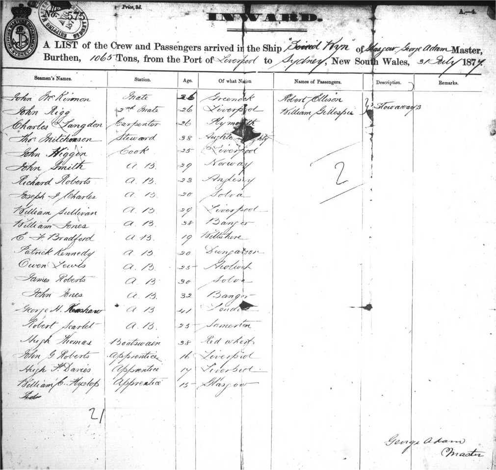 SERIOL WYNof Glasgow, GEORGE ADAM, Master, Burthen 1065 Tons from the Port of LIVERPOOL to SYDNEY, New South Wales, 31st Jul 1877 |
