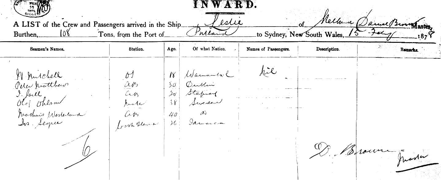 LESLIEof Melbourne, DANIEL BROWN, MASTER, Burthen 108 Tons from the Port of PORTLAND to SYDNEY, New South Wales, 15th Feb. 1878 |