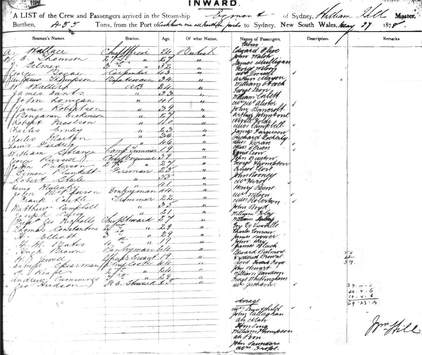 Source: State Records Authority of New South Wales: Shipping Master's Office; CGS 13278, Passengers Arriving 1855 - 1922; X139-140, SR Reel 437, 1878.   Transcribed by Tamea Willcocks, May, 2002.