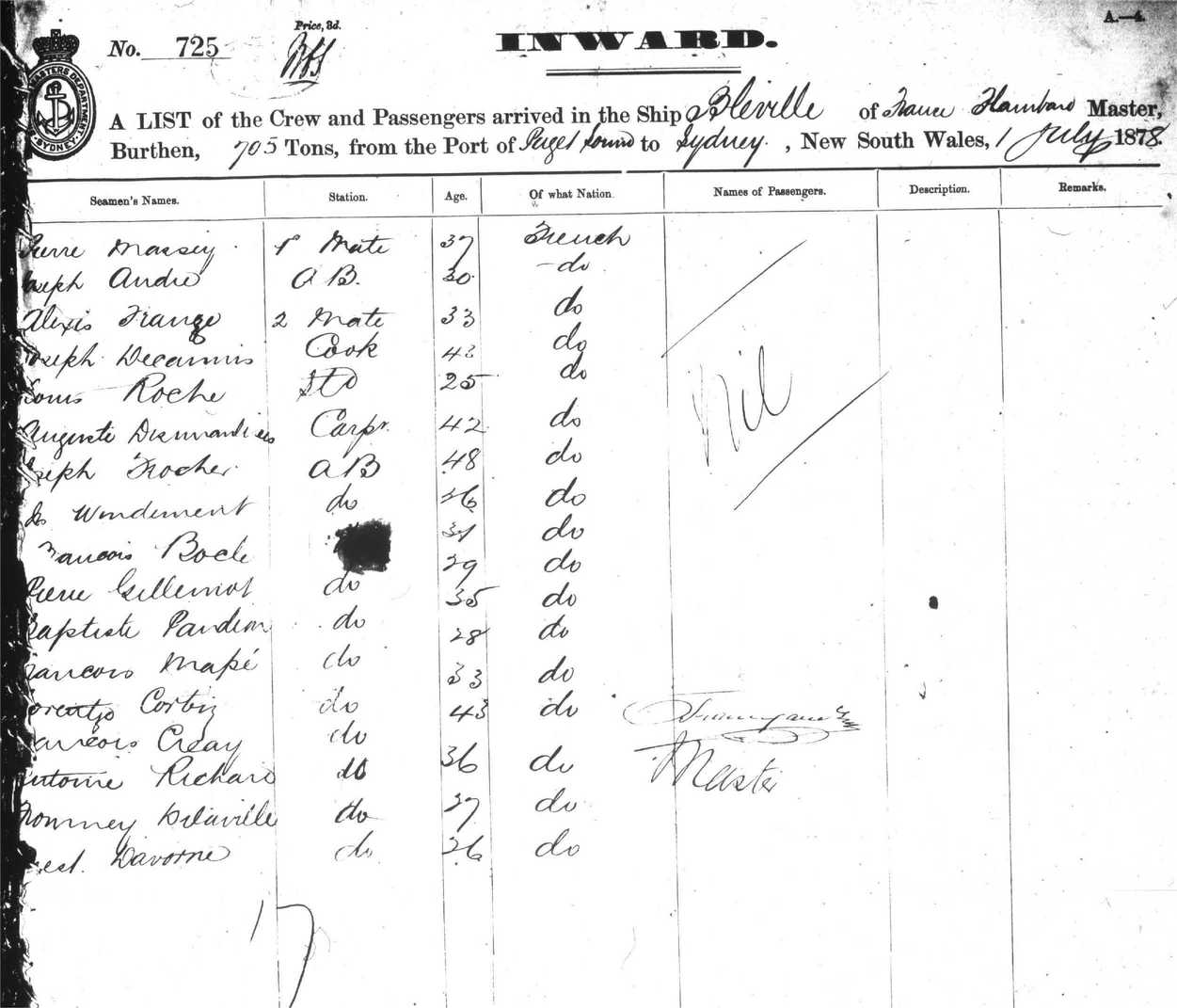 BLEVILLEOF FRANCE, FLAMBARD, MASTER, BURTHEN 705 TONS, FROM THE PORT OF PAGES SOUND TO SYDNEY, NEW SOUTH WALES, JULY 1ST 1878 |