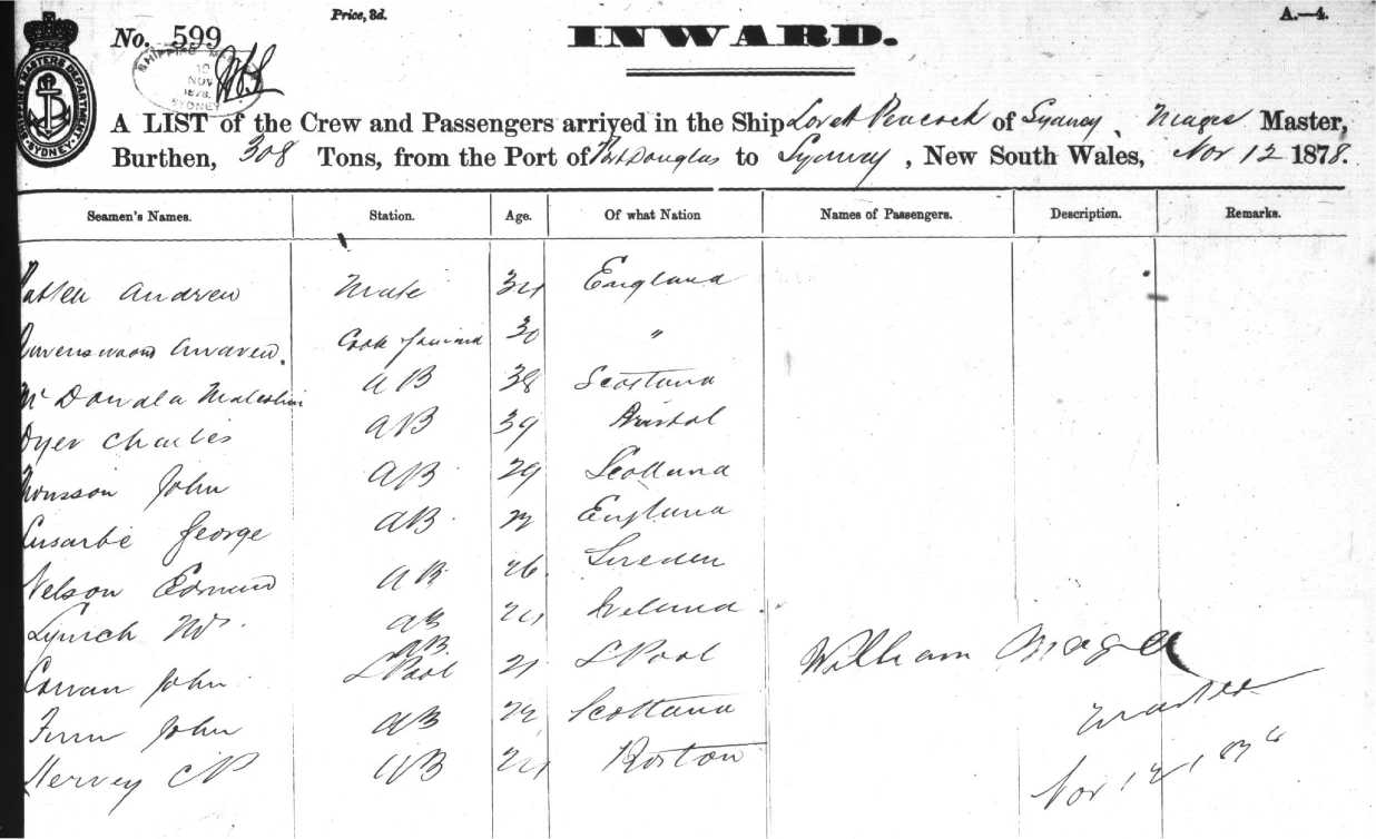 from the Port of PORT DOUGLAS to SYDNEY, New South Wales, 12th Nov. 1878