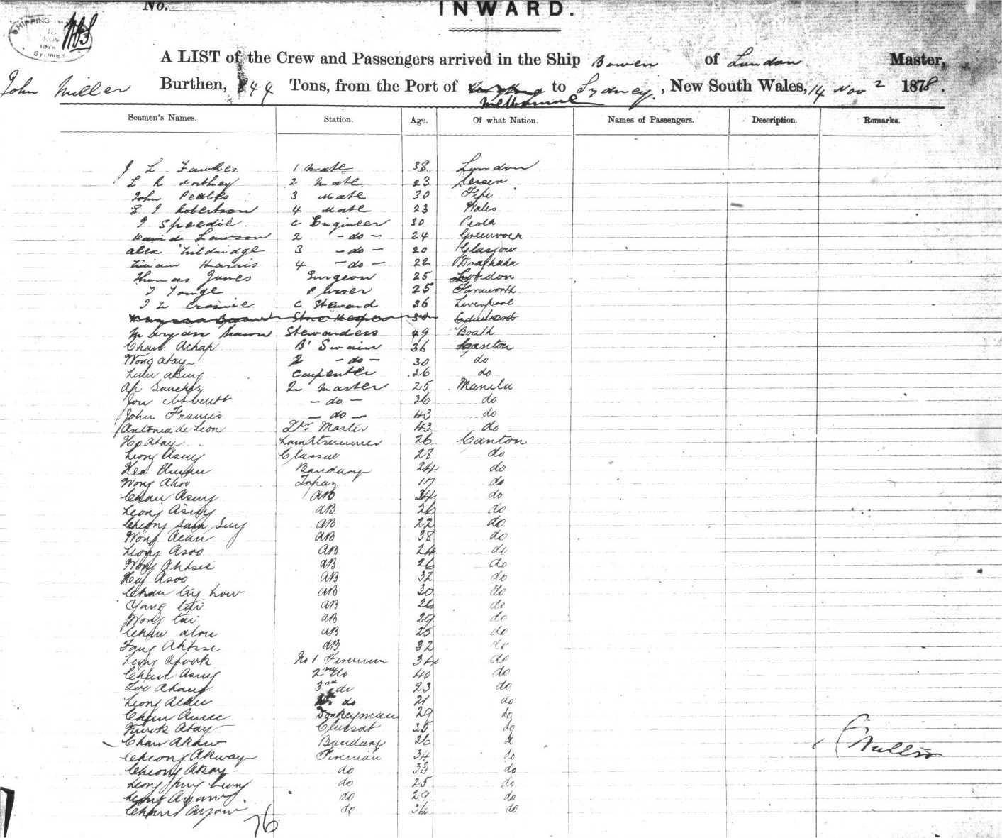 Source: State Records Authority of New South Wales: Shipping Master's Office; CGS 13278, Passengers Arriving 1855 - 1922; X141-142, SR Reel 438, 1878.   Transcribed by Tamea Willcocks, June, 2002.