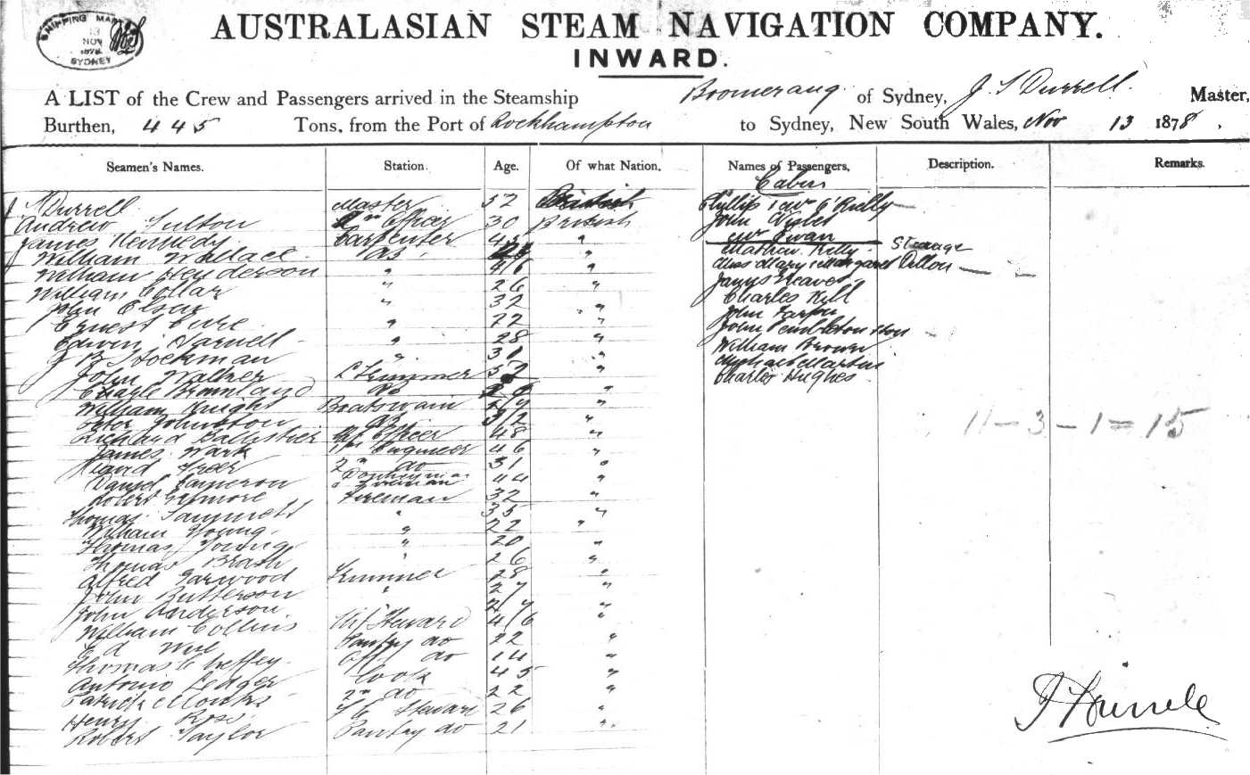 from the Port of ROCKHAMPTON to SYDNEY, New South Wales, 13th Nov. 1878