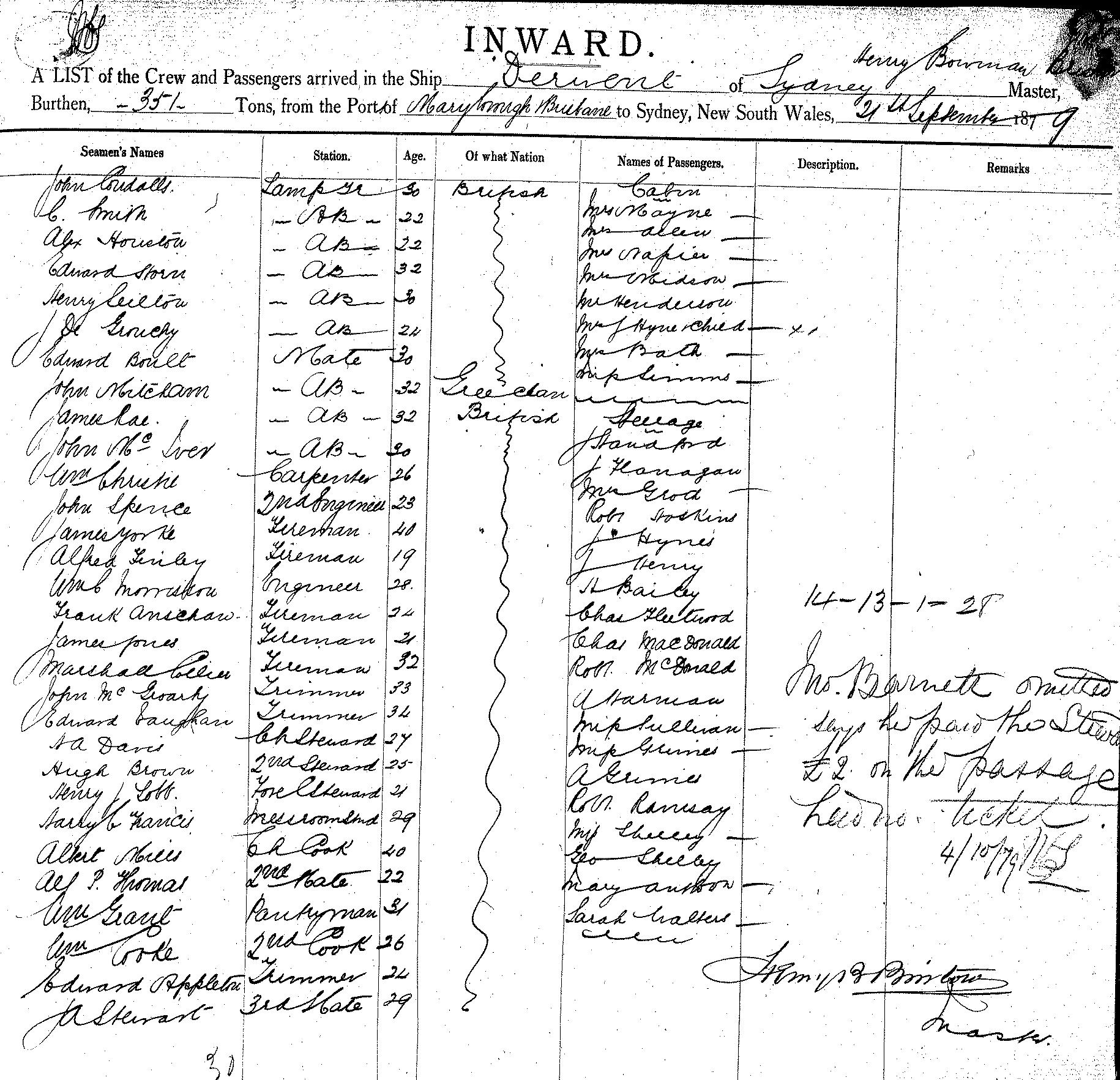 DERWENTOF SYDNEY, HENRY BOWMAN BRISTOW, MASTER, BURTHEN 351 TONS FROM THE PORT OF MARYBOROUGH & BRISBANE TO SYDNEY, NEW SOUTH WALES, 21ST SEPTEMBER 1879 |