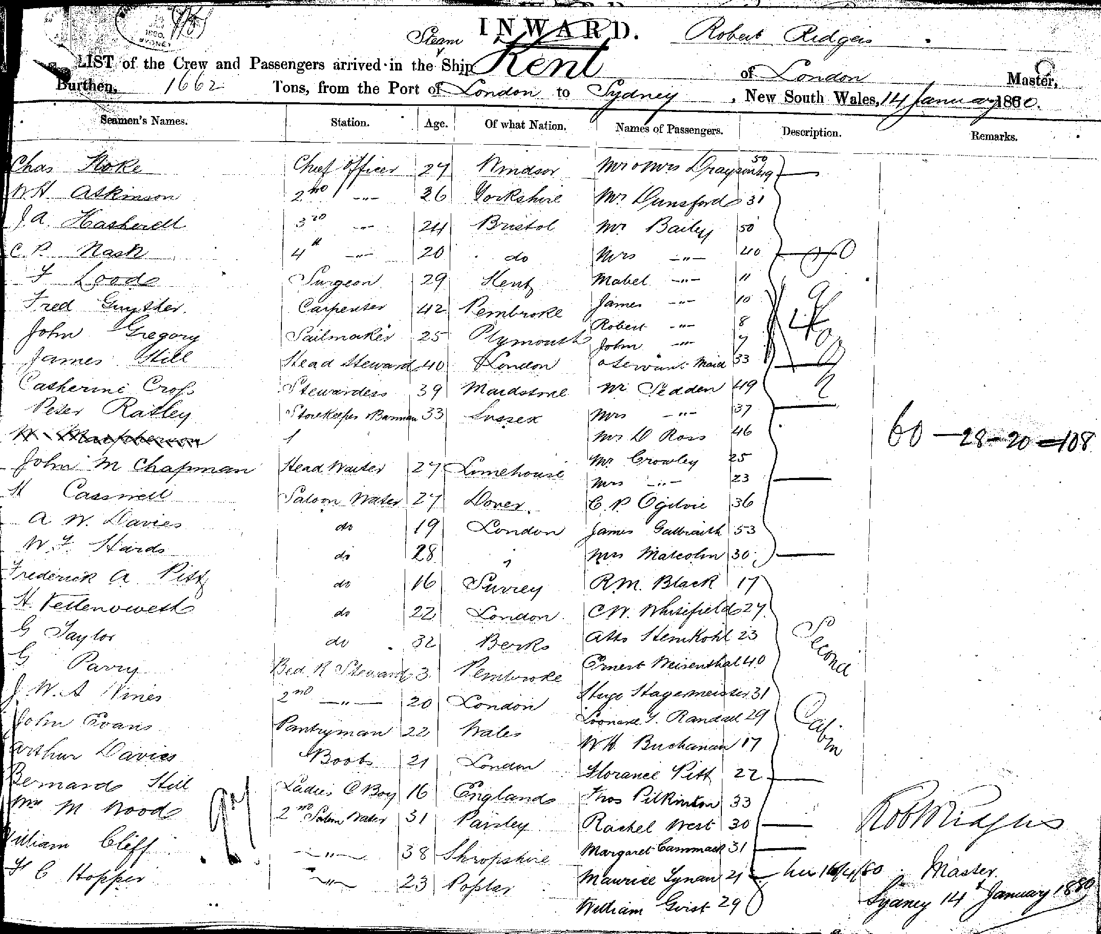 KENTOF LONDON, ROBERT RIDGES, MASTER, BURTHEN 1662 TONS FROM THE PORT OF LONDON TO SYDNEY, NEW SOUTH WALES, 14TH JANUARY 1880 |