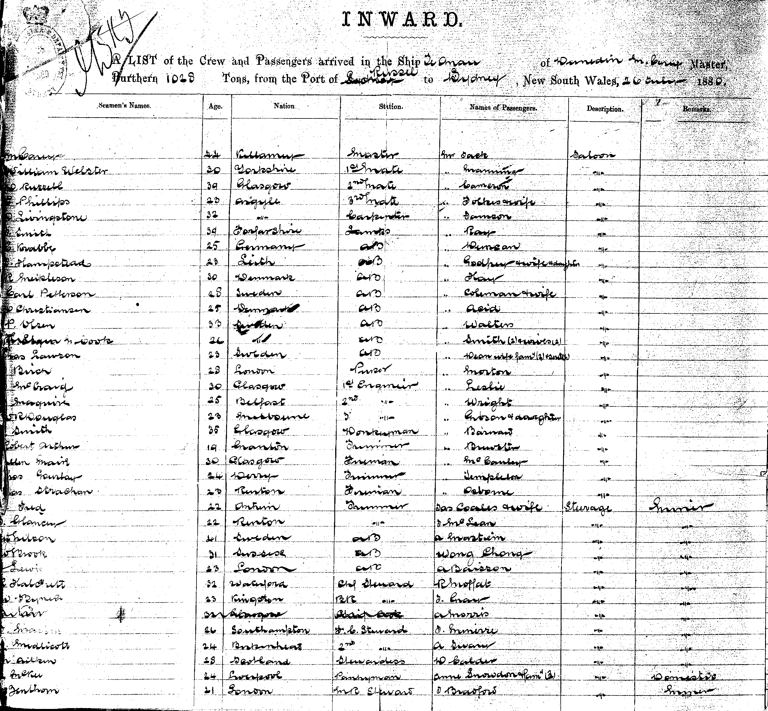 Source: State Records Authority of New South Wales: Shipping Master's Office; Passengers Arriving 1855 - 1922; NRS13278, [X147-149] reel 442. Transcribed by Chris Bryce. You may view/print a scan of the original list - a monitor set to high resolution is recommended for clarity. Use your back button to return. |